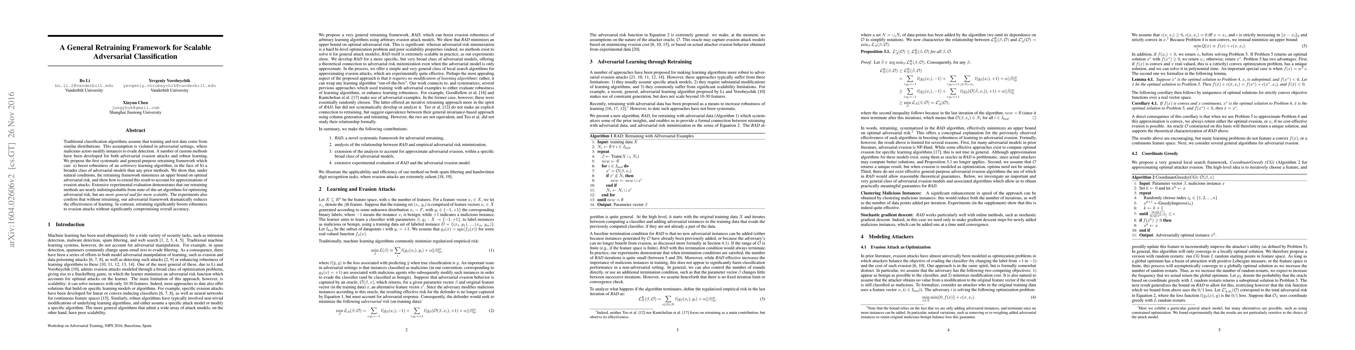 Traditional classification algorithms assume that training and test data come from similar distributions. This assumption is violated in adversarial settings, where malicious actors modify instances to evade detection. A number of custom methods have been developed for both adversarial evasion attacks and robust learning. We propose the first systematic and general-purpose retraining framework which can: a) boost robustness of an \emph{arbitrary} learning algorithm, in the face of b) a broader class of adversarial models than any prior methods. We show that, under natural conditions, the retraining framework minimizes an upper bound on optimal adversarial risk, and show how to extend this result to account for approximations of evasion attacks. Extensive experimental evaluation demonstrates that our retraining methods are nearly indistinguishable from state-of-the-art algorithms for optimizing adversarial risk, but are more general and far more scalable. The experiments also confirm that without retraining, our adversarial framework dramatically reduces the effectiveness of learning. In contrast, retraining significantly boosts robustness to evasion attacks without significantly compromising overall accuracy.