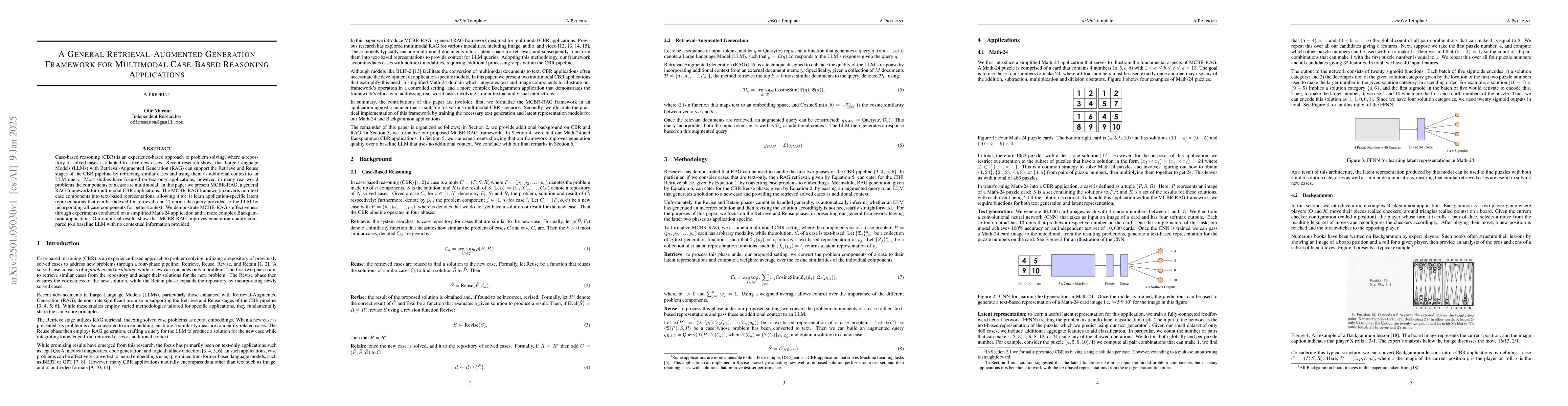 This paper introduces MCBR-RAG, a framework that uses Retrieval-Augmented Generation (RAG) to enhance multimodal case-based reasoning (CBR) applications. It converts non-text case components into text-based forms to enrich context for large language models, improving generation quality in Math-24 and Backgammon applications.