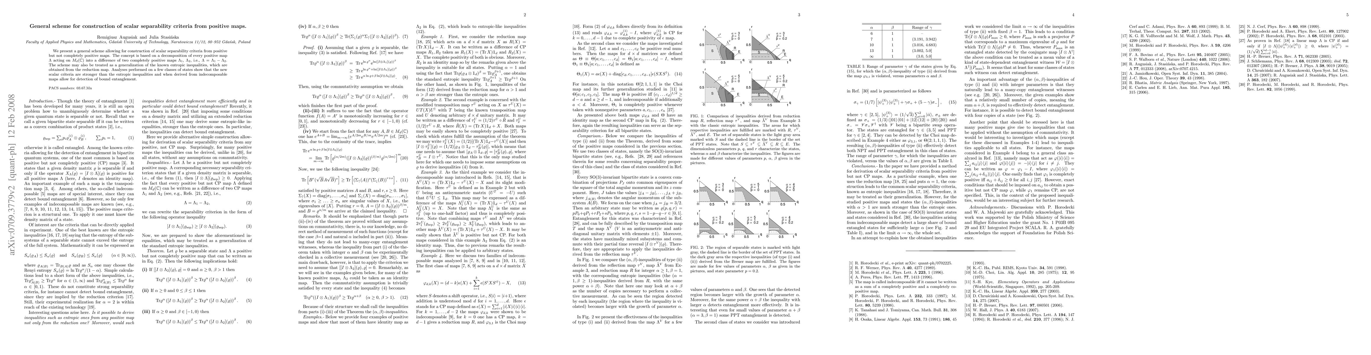 We present a general scheme that allows for construction of scalar separability criteria from positive but not completely positive maps. The concept is based on a decomposition of every positive map $\Lambda$ into a difference of two completely positive maps $\Lambda_1$, $\Lambda_2$, i.e., $\Lambda=\Lambda_1-\Lambda_2$. The scheme may be also treated as a generalization of the known entropic inequalities, which are obtained from the reduction map. An analysis performed on few classes of states shows that the new scalar criteria are stronger than the entropic inequalities and furthermore, when derived from indecomposable maps allow for detection of bound entanglement.