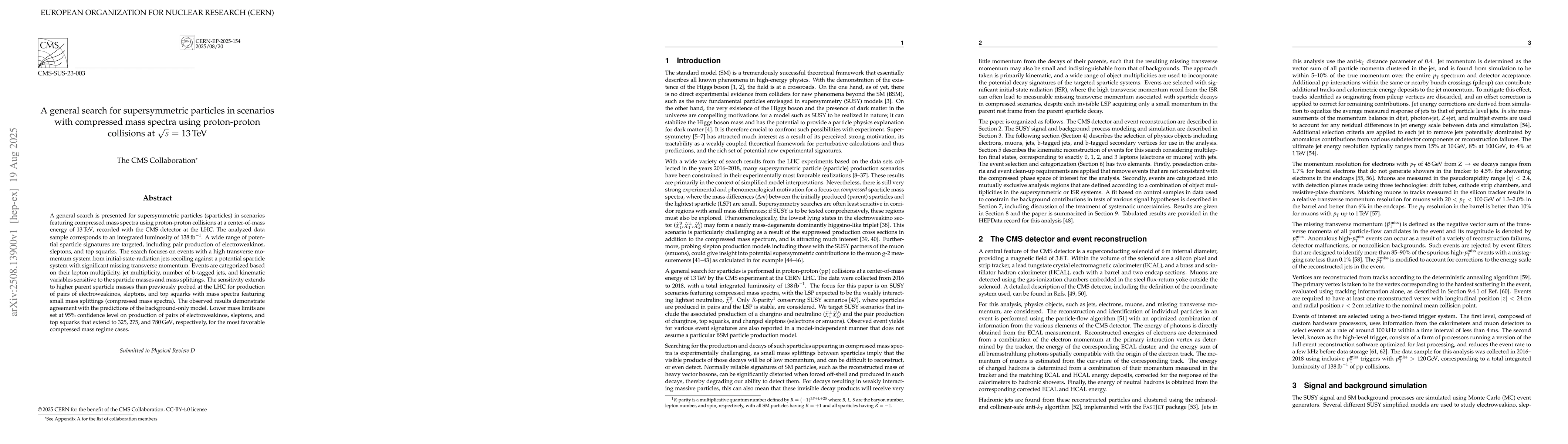 A general search is presented for supersymmetric particles (sparticles) in scenarios featuring compressed mass spectra using proton-proton collisions at a center-of-mass energy of 13 TeV, recorded with the CMS detector at the LHC. The analyzed data sample corresponds to an integrated luminosity of 138\fbinv. A wide range of potential sparticle signatures are targeted, including pair production of electroweakinos, sleptons, and top squarks. The search focuses on events with a high transverse momentum system from initial-state-radiation jets recoiling against a potential sparticle system with significant missing transverse momentum. Events are categorized based on their lepton multiplicity, jet multiplicity, number of b-tagged jets, and kinematic variables sensitive to the sparticle masses and mass splittings. The sensitivity extends to higher parent sparticle masses than previously probed at the LHC for production of pairs of electroweakinos, sleptons, and top squarks with mass spectra featuring small mass splittings (compressed mass spectra). The observed results demonstrate agreement with the predictions of the background-only model. Lower mass limits are set at 95% confidence level on production of pairs of electroweakinos, sleptons, and top squarks that extend to 325, 275, and 780 GeV, respectively, for the most favorable compressed mass regime cases.