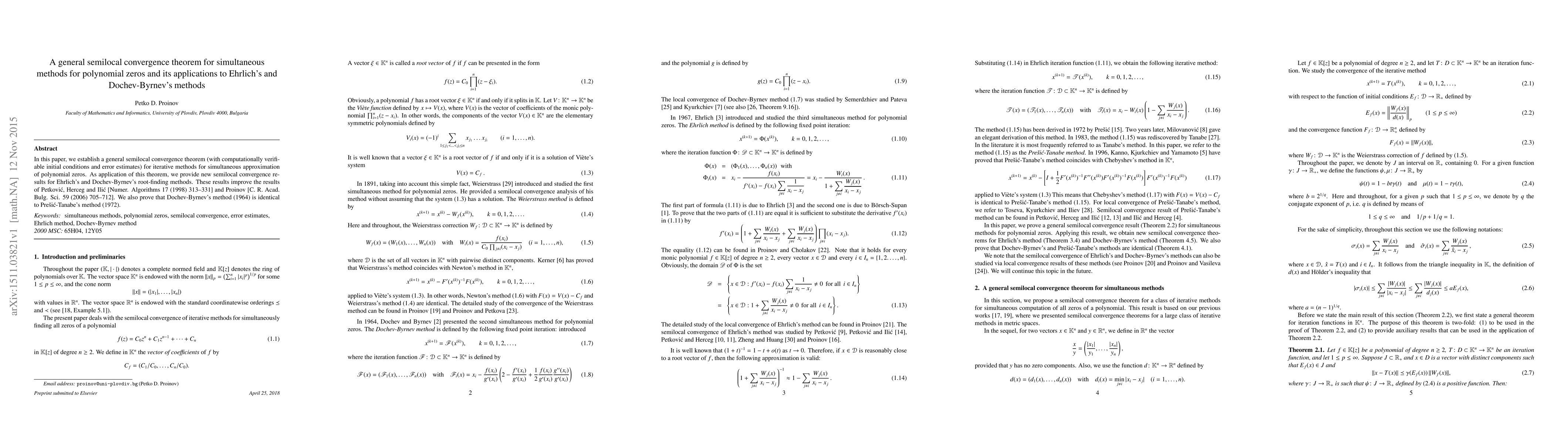 This paper establishes a general semilocal convergence theorem for iterative methods to approximate polynomial zeros, providing verifiable initial conditions and error estimates. It applies this theorem to enhance the convergence results for Ehrlich's and Dochev-Byrnev's root-finding methods, surpassing previous findings, and reveals the equivalence of Dochev-Byrnev's and Prešić-Tanabe's methods.