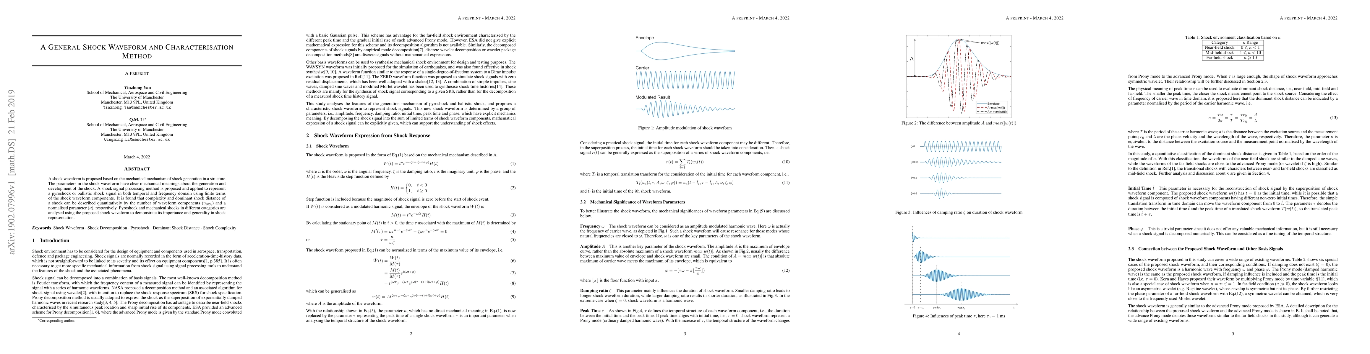 A shock waveform is proposed based on the mechanical mechanism of shock generation in a structure. The parameters in the shock waveform have clear mechanical meanings about the generation and development of the shock. A shock signal processing method is proposed and applied to represent a pyroshock or ballistic shock signal in both temporal and frequency domain using finite terms of the shock waveform components. It is found that complexity and dominant shock distance of a shock can be described quantitatively by the number of waveform components ($\eta_{90\%}$) and a normalised parameter ($\kappa$), respectively. Pyroshock and mechanical shocks in different categories are analysed using the proposed shock waveform to demonstrate its importance and generality in shock representation.