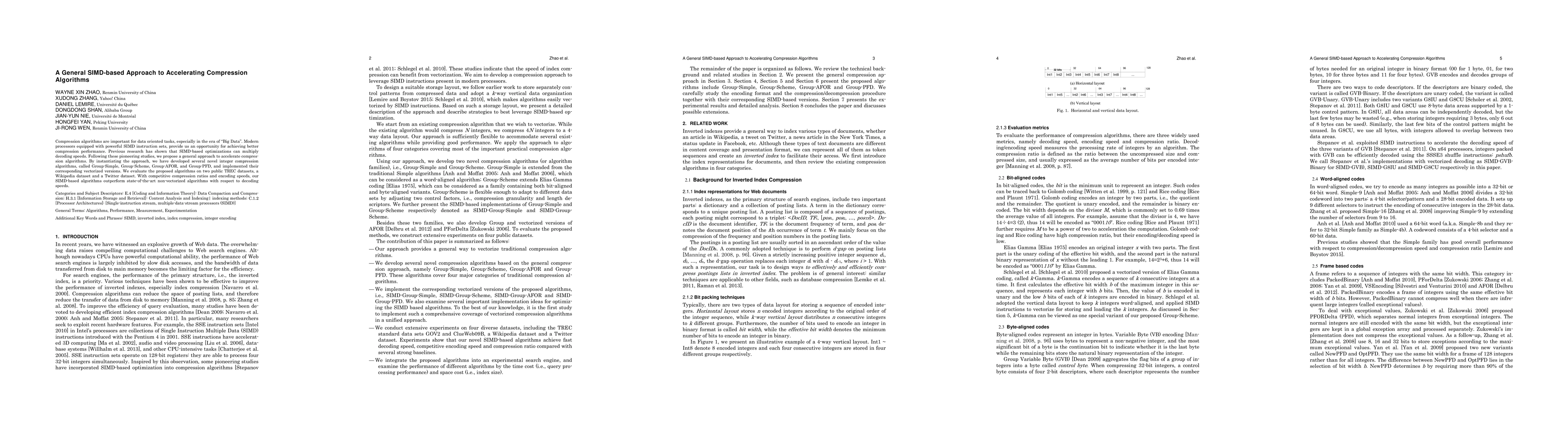 This paper proposes a general SIMD-based approach to accelerate compression algorithms, developing four novel vectorized integer compression algorithms. Evaluations on TREC datasets show that these SIMD-optimized algorithms outperform existing non-vectorized methods in decoding speeds while maintaining competitive compression ratios.