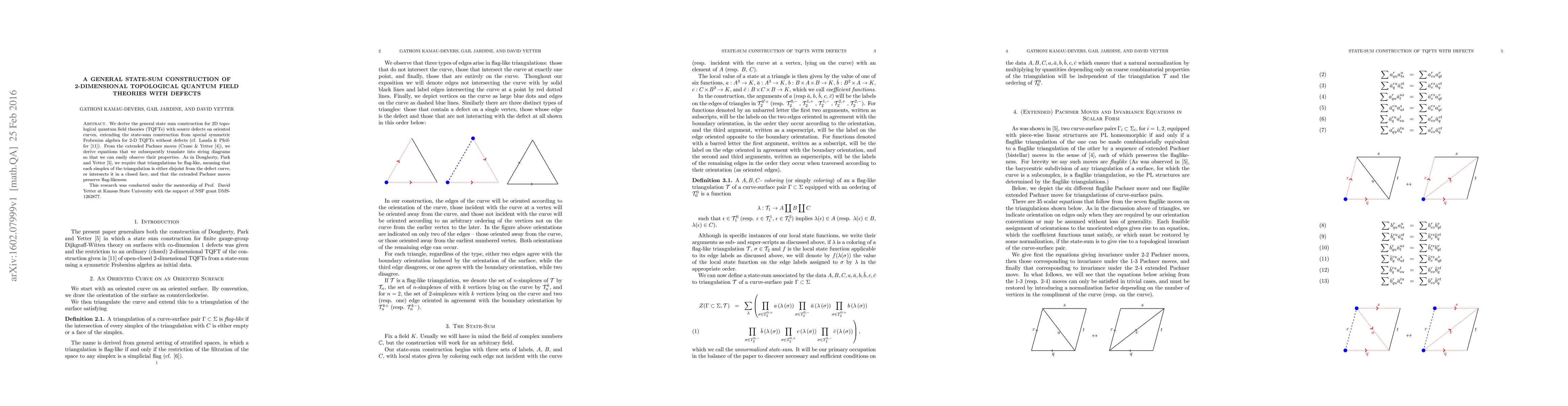 We derive the general state sum construction for 2D topological quantum field theories (TQFTs) with source defects on oriented curves, extending the state-sum construction from special symmetric Frobenius algebra for 2-D TQFTs without defects (cf. Lauda \& Pfeiffer \cite{LP}). From the extended Pachner moves (Crane \& Yetter \cite{CY}), we derive equations that we subsequently translate into string diagrams so that we can easily observe their properties. As in Dougherty, Park and Yetter \cite{DPY}, we require that triangulations be flag-like, meaning that each simplex of the triangulation is either disjoint from the defect curve, or intersects it in a closed face, and that the extended Pachner moves preserve flag-likeness. This research was conducted under the mentorship of Prof. David Yetter at Kansas State University with the support of NSF grant DMS-1262877.