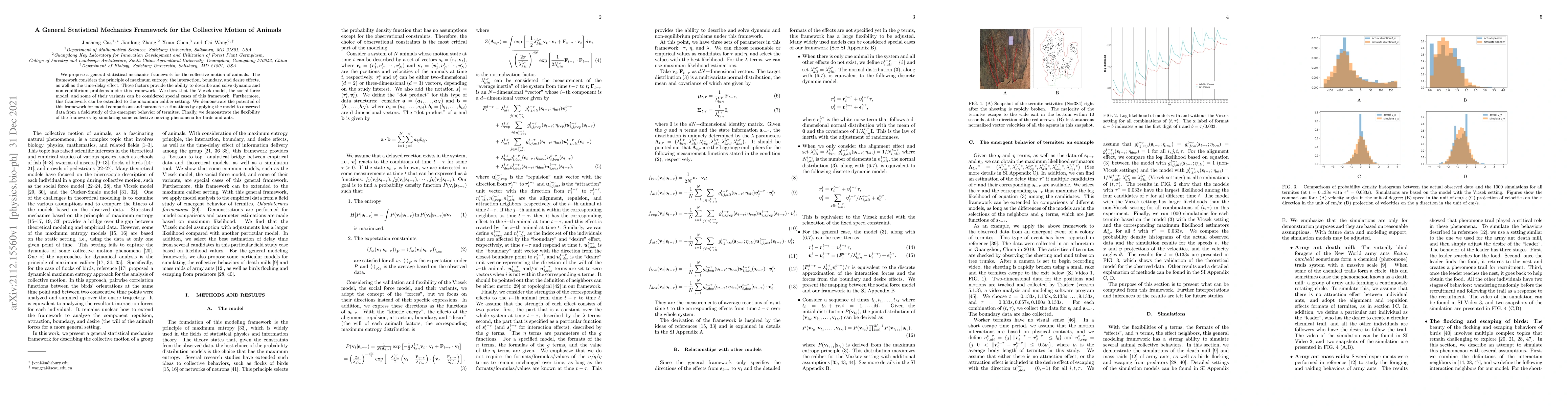 This paper proposes a comprehensive statistical mechanics framework for modeling the collective motion of animals, incorporating principles of maximum entropy and various effects like interaction, boundary, desire, and time-delay. The framework generalizes existing models and demonstrates its application through analysis of termite behavior and simulations of bird and ant movements.