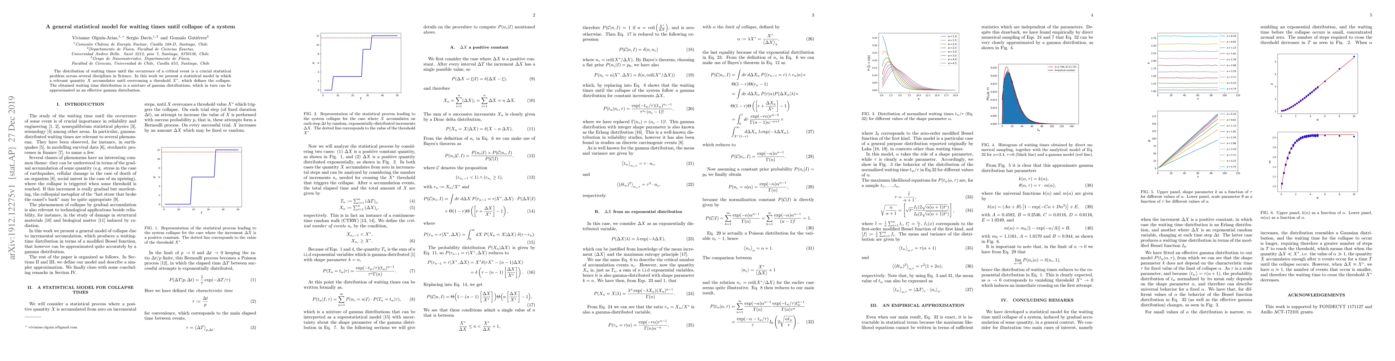 This research introduces a statistical model for estimating waiting times until system collapse, where a quantity accumulates until surpassing a threshold, resulting in a waiting time distribution modeled as a mixture of gamma distributions, effectively approximated by a gamma distribution.