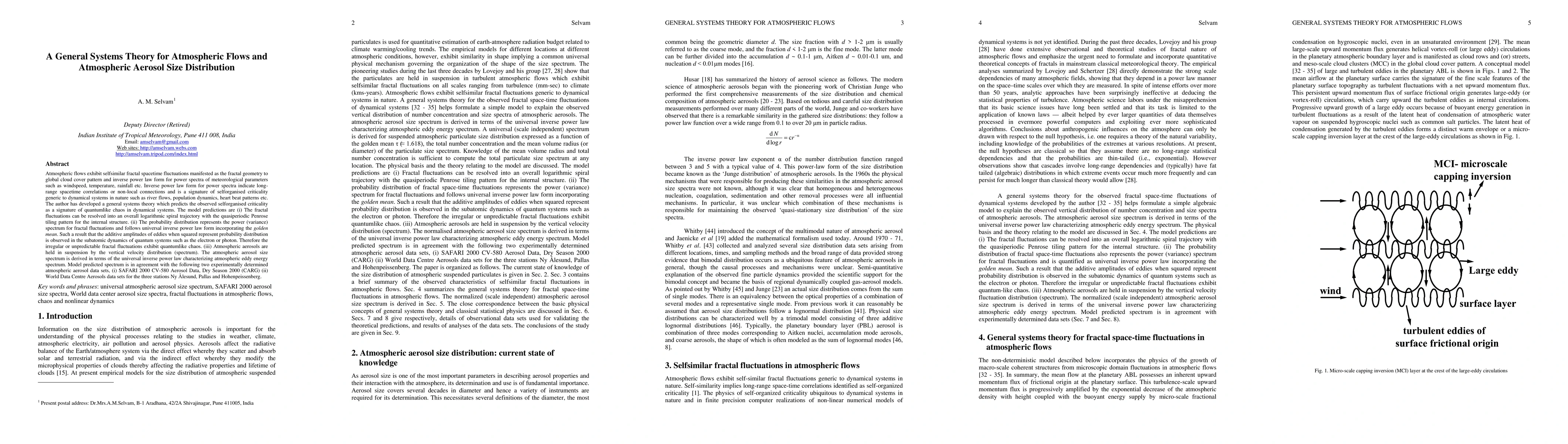 This paper proposes a general systems theory explaining atmospheric flows and aerosol size distribution through fractal geometry and quantumlike chaos. The theory suggests selforganised criticality in atmospheric dynamics, characterized by an inverse power law for power spectra, and predicts a logarithmic spiral trajectory for fractal fluctuations.