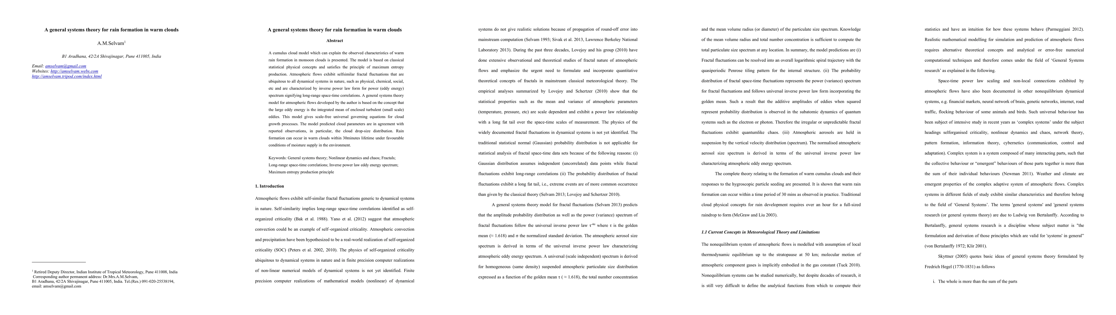 This paper presents a cumulus cloud model explaining warm rain formation in monsoon clouds, grounded in classical statistical physics and maximum entropy production. The model leverages a general systems theory based on fractal fluctuations and scale-free equations, accurately predicting cloud dropsize distribution and rain formation within 30 minutes under favorable conditions.