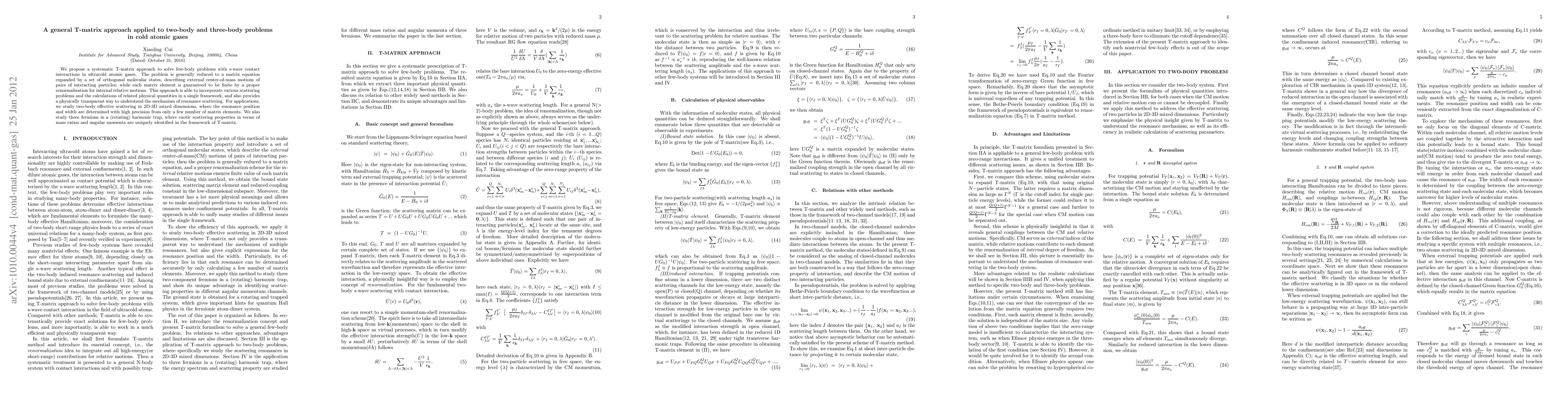We propose a systematic T-matrix approach to solve few-body problems with s-wave contact interactions in ultracold atomic gases. The problem is generally reduced to a matrix equation expanded by a set of orthogonal molecular states, describing external center-of-mass motions of pairs of interacting particles; while each matrix element is guaranteed to be finite by a proper renormalization for internal relative motions. This approach is able to incorporate various scattering problems and the calculations of related physical quantities in a single framework, and also provides a physically transparent way to understand the mechanism of resonance scattering. For applications, we study two-body effective scattering in 2D-3D mixed dimensions, where the resonance position and width are determined with high precision from only a few number of matrix elements. We also study three fermions in a (rotating) harmonic trap, where exotic scattering properties in terms of mass ratios and angular momenta are uniquely identified in the framework of T-matrix.