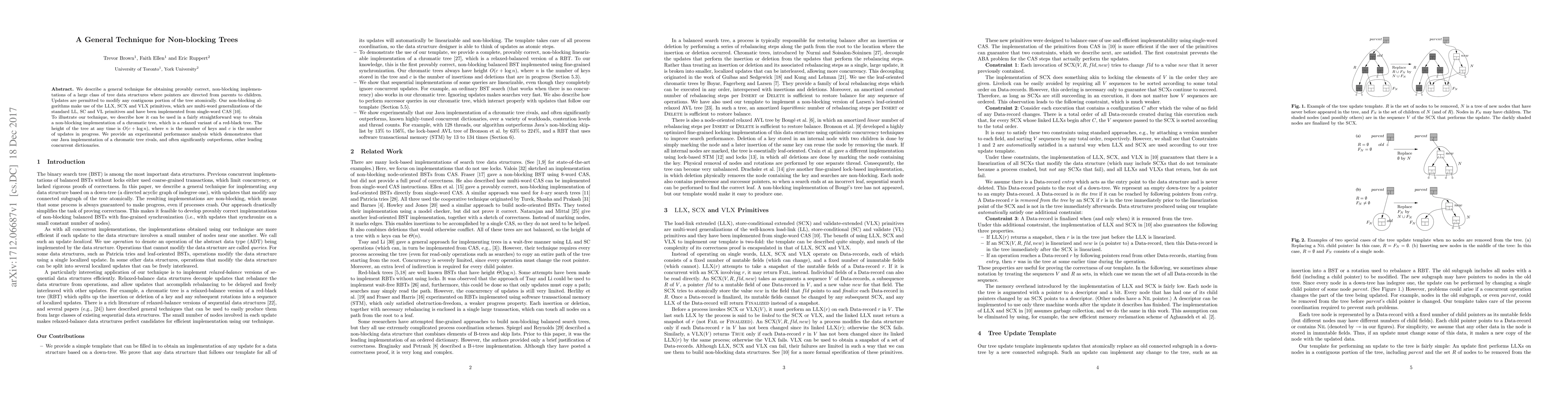This paper presents a general technique for creating provably correct, non-blocking implementations of tree data structures with parent-to-child pointers, using LLX, SCX, and VLX primitives. It demonstrates the technique through a non-blocking chromatic tree, showing competitive performance against other concurrent dictionaries.