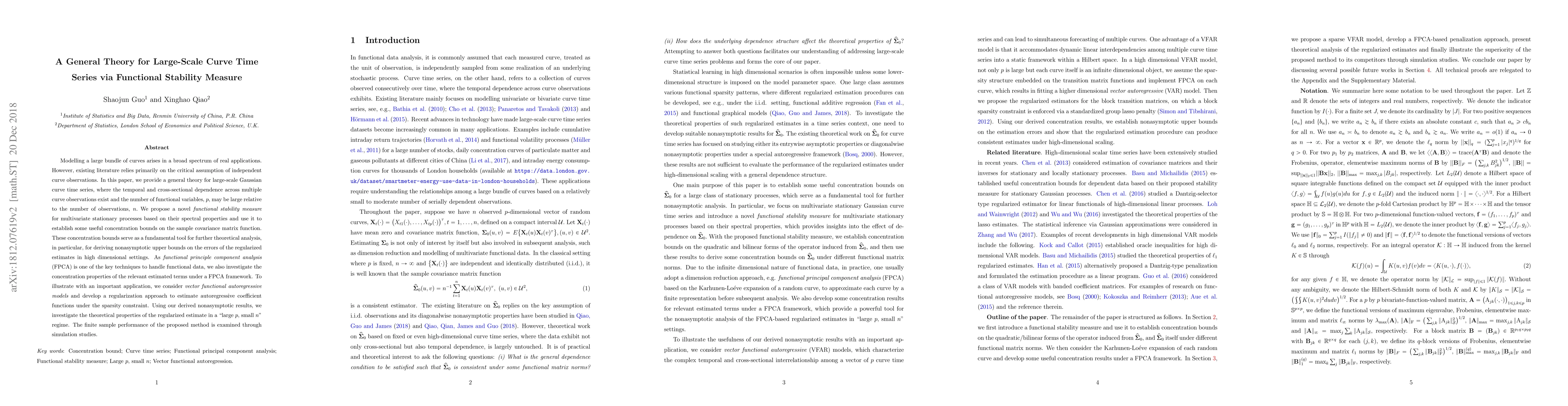 Modelling a large bundle of curves arises in a broad spectrum of real applications. However, existing literature relies primarily on the critical assumption of independent curve observations. In this paper, we provide a general theory for large-scale Gaussian curve time series, where the temporal and cross-sectional dependence across multiple curve observations exist and the number of functional variables, $p,$ may be large relative to the number of observations, $n.$ We propose a novel functional stability measure for multivariate stationary processes based on their spectral properties and use it to establish some useful concentration bounds on the sample covariance matrix function. These concentration bounds serve as a fundamental tool for further theoretical analysis, in particular, for deriving nonasymptotic upper bounds on the errors of the regularized estimates in high dimensional settings. As {\it functional principle component analysis} (FPCA) is one of the key techniques to handle functional data, we also investigate the concentration properties of the relevant estimated terms under a FPCA framework. To illustrate with an important application, we consider {\it vector functional autoregressive models} and develop a regularization approach to estimate autoregressive coefficient functions under the sparsity constraint. Using our derived nonasymptotic results, we investigate the theoretical properties of the regularized estimate in a "large $p,$ small $n$" regime. The finite sample performance of the proposed method is examined through simulation studies.