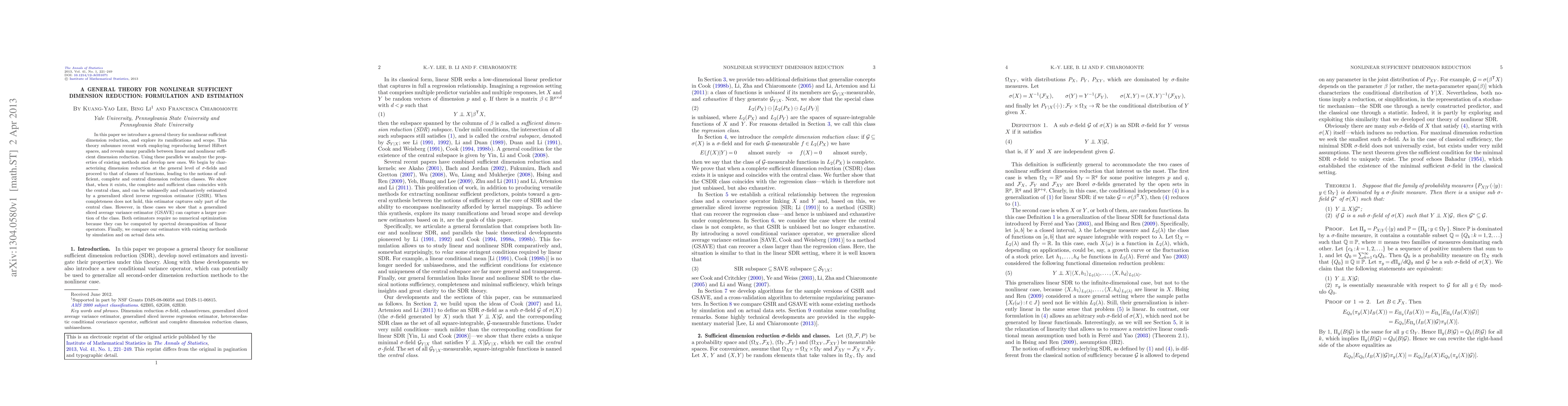 This paper develops a general theory for nonlinear sufficient dimension reduction, introducing new estimators for estimating the central class of functions. It compares the proposed generalized sliced inverse regression estimator (GSIR) and generalized sliced average variance estimator (GSAVE) with existing methods through simulations and real data analysis.