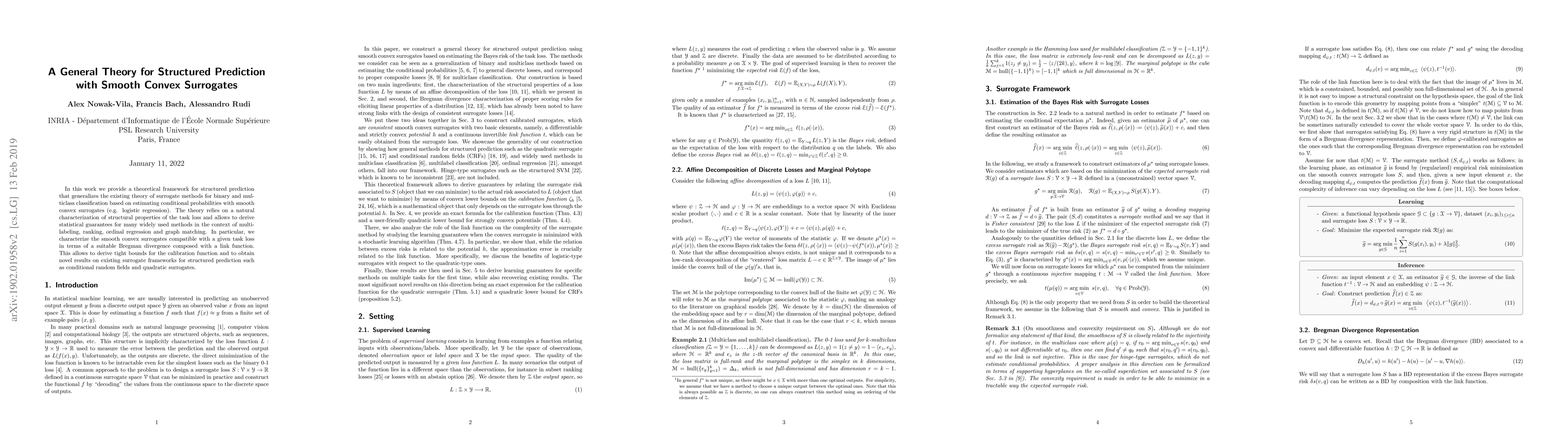This paper develops a theoretical framework for structured prediction that extends existing surrogate methods for classification using smooth convex surrogates. It characterizes the compatibility of these surrogates with task losses via a Bregman divergence and link function, providing statistical guarantees for methods like multilabeling and ranking.