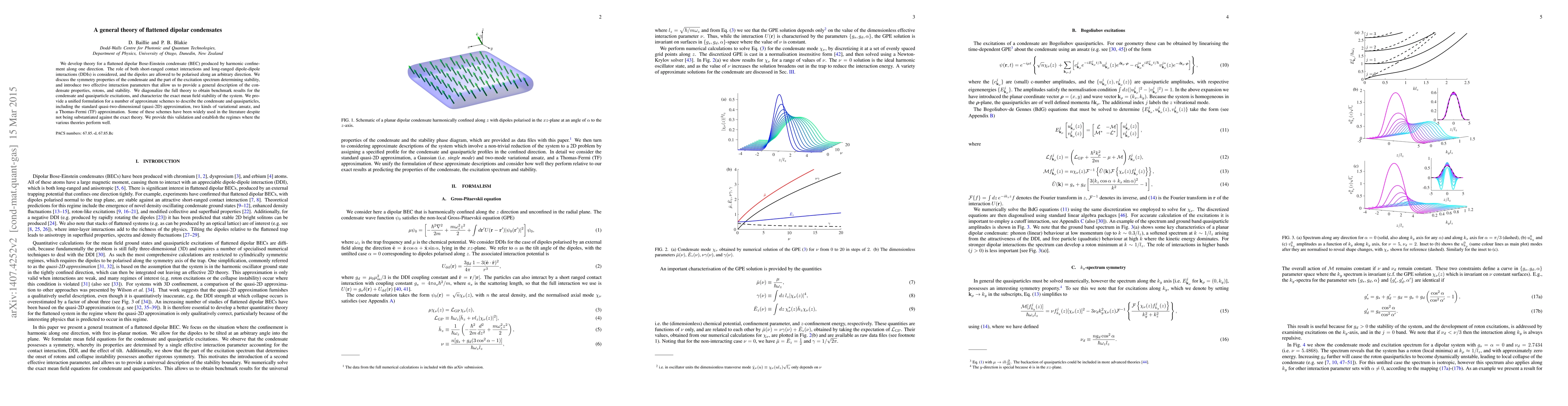 We develop theory for a flattened dipolar Bose-Einstein condensate (BEC) produced by harmonic confinement along one direction. The role of both short-ranged contact interactions and long-ranged dipole-dipole interactions (DDIs) is considered, and the dipoles are allowed to be polarised along an arbitrary direction. We discuss the symmetry properties of the condensate and the part of the excitation spectrum determining stability, and introduce two effective interaction parameters that allow us to provide a general description of the condensate properties, rotons, and stability. We diagonalize the full theory to obtain benchmark results for the condensate and quasiparticle excitations, and characterize the exact mean field stability of the system. We provide a unified formulation for a number of approximate schemes to describe the condensate and quasiparticles, including the standard quasi-two-dimensional (quasi-2D) approximation, two kinds of variational ansatz, and a Thomas-Fermi (TF) approximation. Some of these schemes have been widely used in the literature despite not being substantiated against the exact theory. We provide this validation and establish the regimes where the various theories perform well.