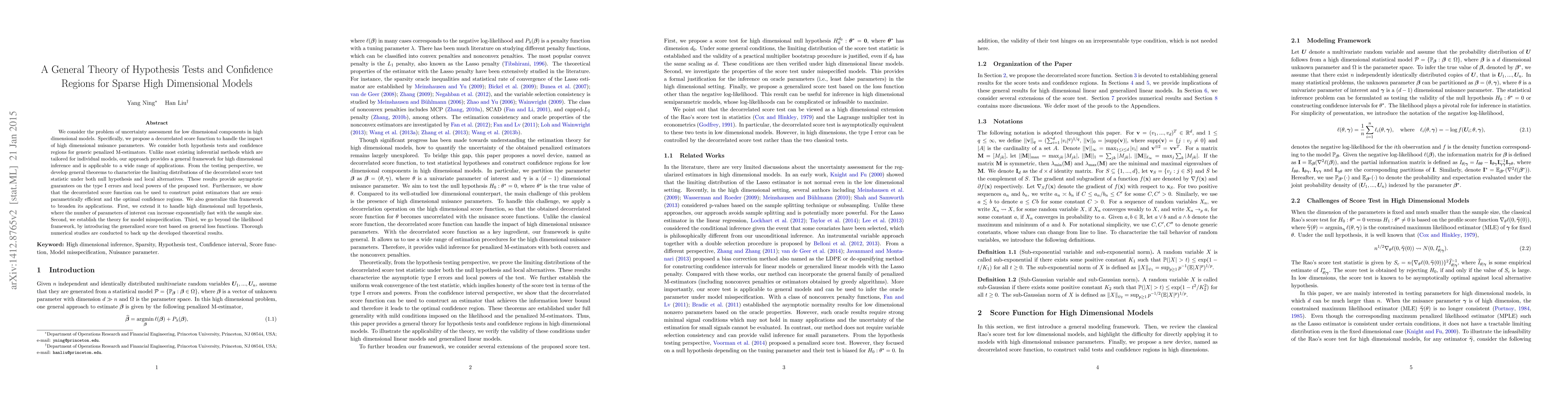 This paper proposes a general framework for hypothesis tests and confidence regions in sparse high-dimensional models, using a decorrelated score function to manage high-dimensional nuisance parameters. It provides asymptotic guarantees for test statistics and constructs semiparametrically efficient estimators, extending its applicability to various scenarios including model misspecification and beyond the likelihood framework.
