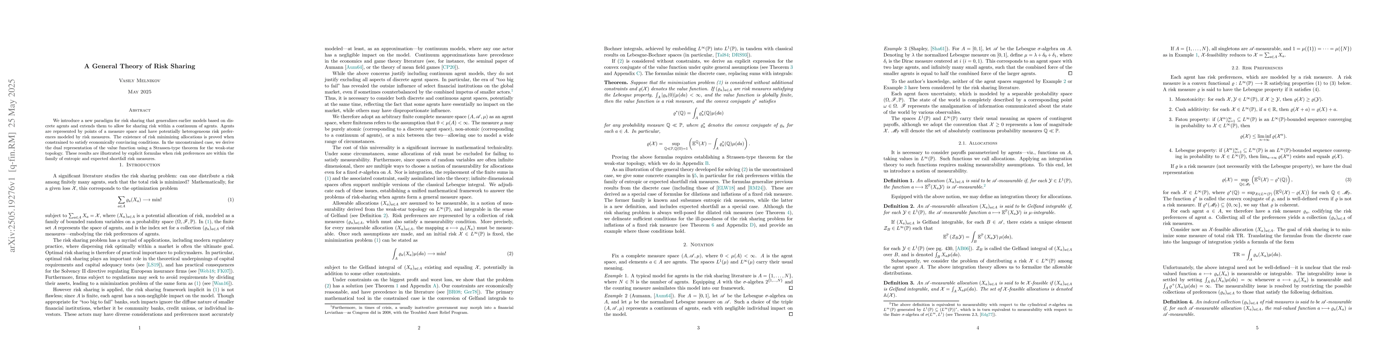 The paper introduces a new paradigm for risk sharing, generalizing earlier models based on discrete agents to include a continuum of agents represented by points of a measure space, with heterogeneous risk preferences modeled by risk measures.