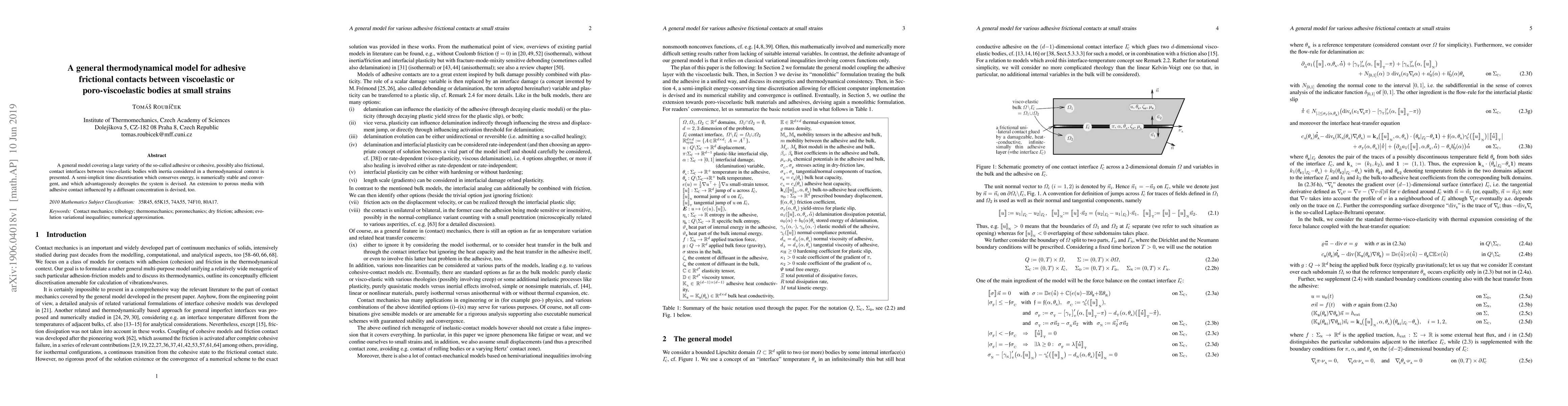 A general model covering a large variety of the so-called adhesive or cohesive, possibly also frictional, contact interfaces between visco-elastic bodies with inertia considered in a thermodynamical context is presented. A semi-implicit time discretisation which conserves energy, is numerically stable and convergent, and which advantageously decouples the system is devised. An extension to porous media with adhesive contact influenced by a diffusant concentration is devised, too.