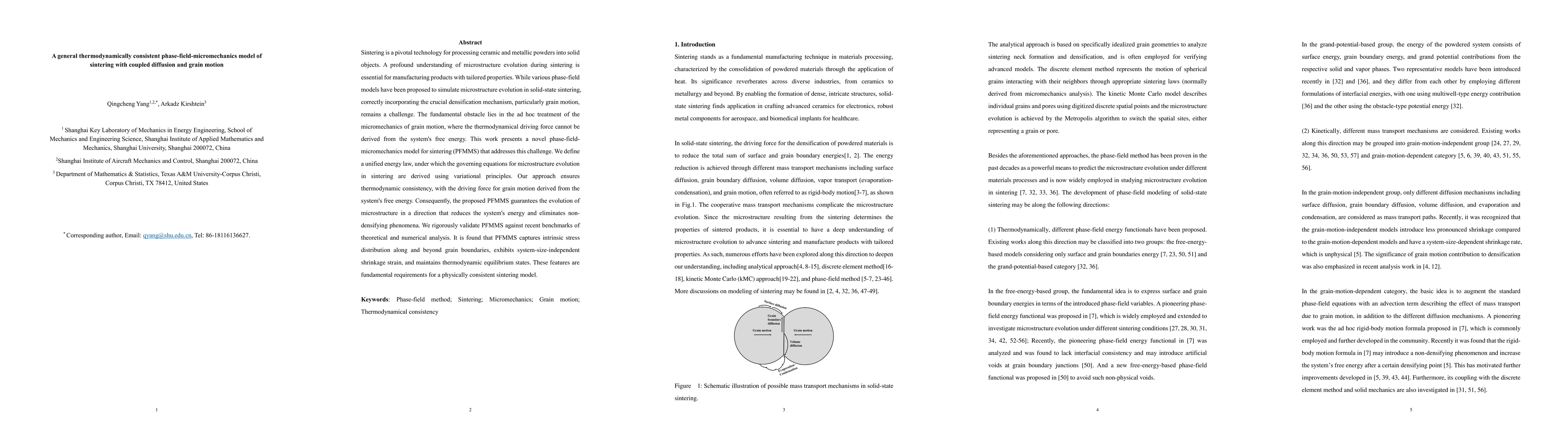 This paper proposes a thermodynamically consistent phase-field-micromechanics model (PFMMS) for sintering that incorporates coupled diffusion and grain motion, addressing the challenge of deriving the thermodynamic driving force for grain motion from the system's free energy. The model ensures microstructure evolution that reduces system energy and eliminates non-densifying phenomena, validated against benchmarks for intrinsic stress distribution and thermodynamic equilibrium.