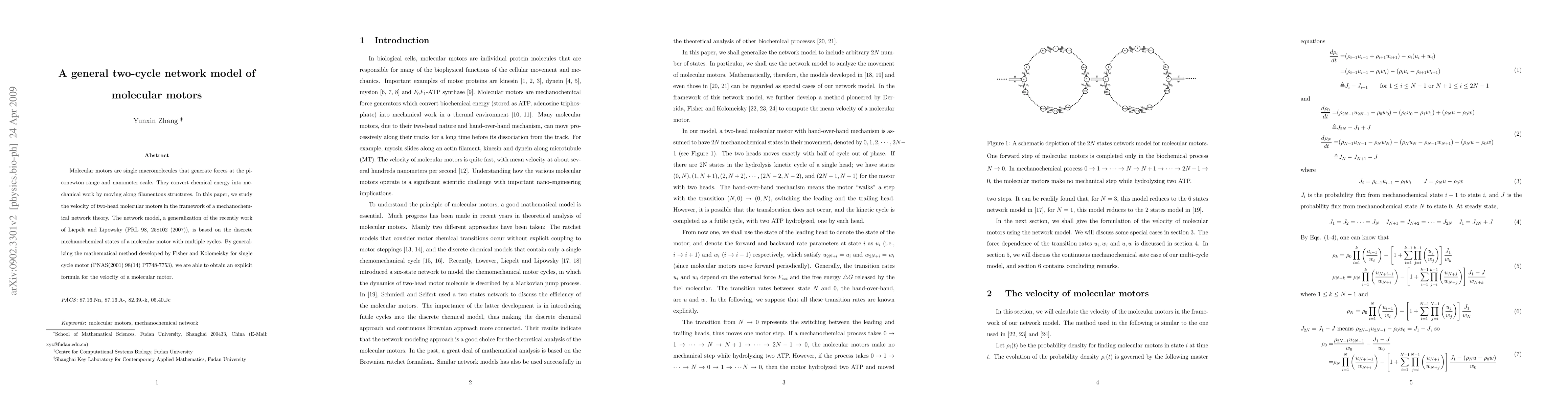 This paper develops a generalized two-cycle network model for two-head molecular motors, extending previous work on mechanochemical network theory. It provides an explicit formula for motor velocity by adapting mathematical methods from Fisher and Kolomeisky's single-cycle model.