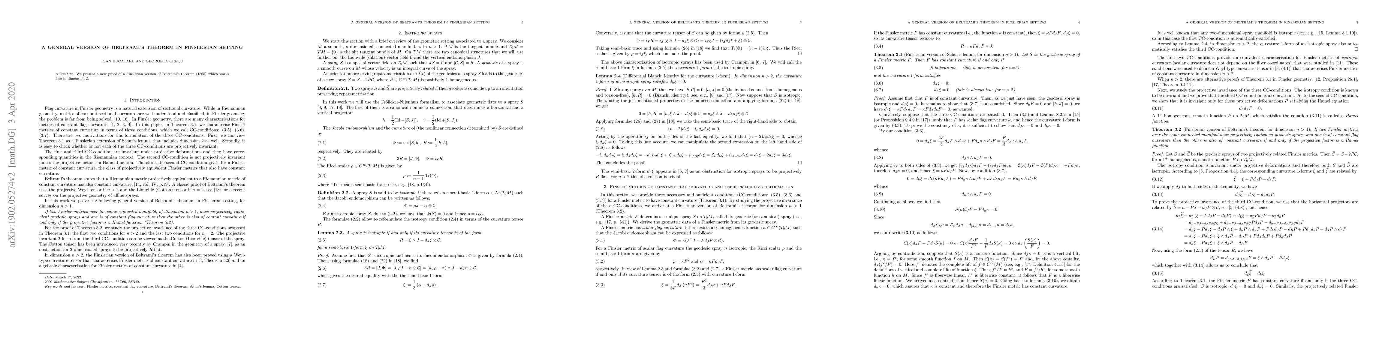 We present a new proof of a Finslerian version of Beltrami's theorem (1865) which works also in dimension 2.