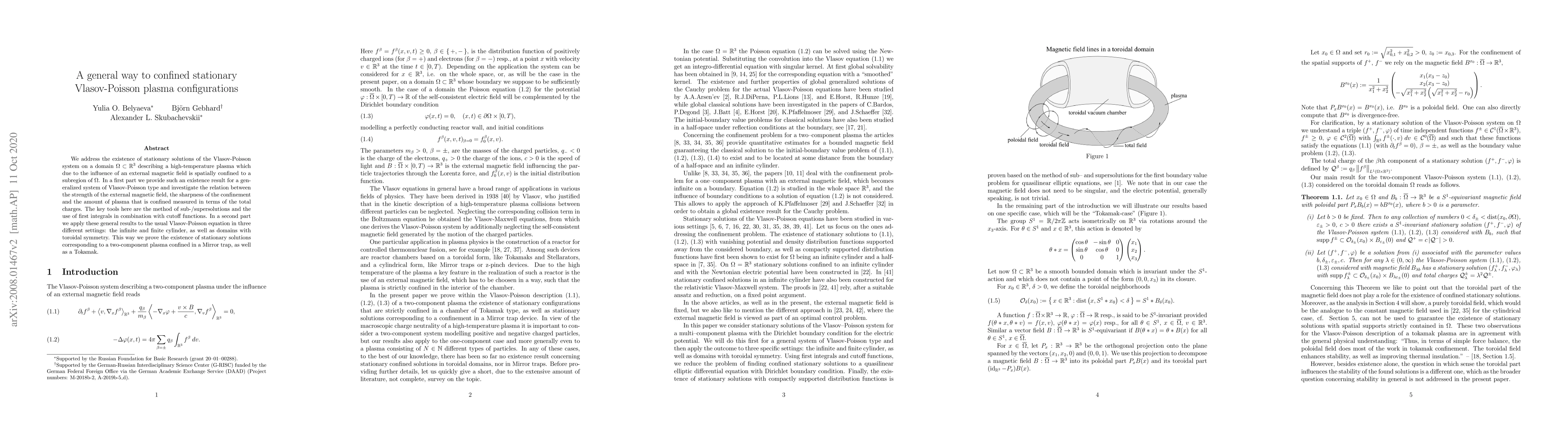This paper establishes the existence of stationary solutions for a generalized Vlasov-Poisson system describing high-temperature plasma confined by an external magnetic field, using sub-/supersolutions and first integrals. It then applies these results to specific geometries, proving the existence of solutions for plasmas in Mirror traps and Tokamaks.