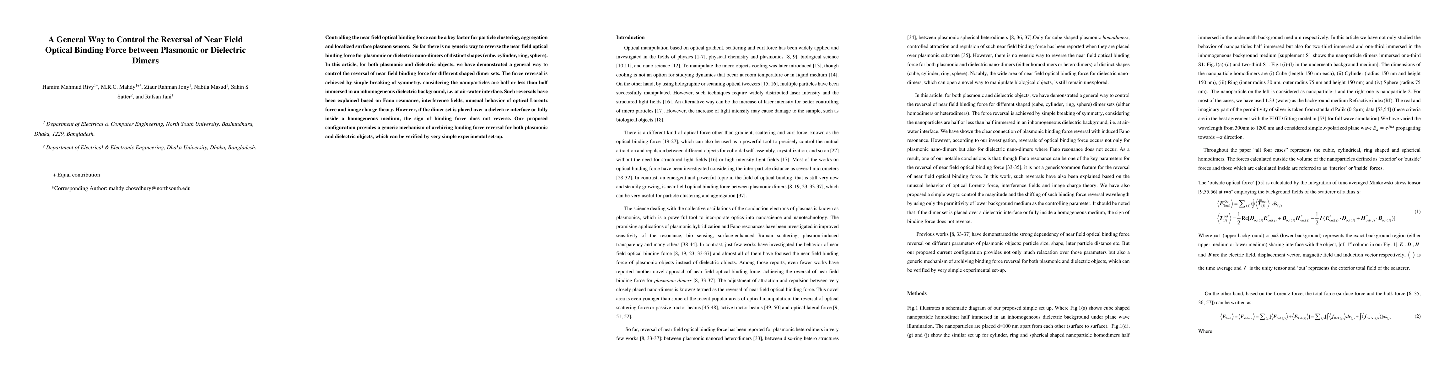 Controlling the near field optical binding force can be a key factor for particle clustering, aggregation and localized surface plasmon sensors. So far there is no generic way to reverse the near field optical binding force for plasmonic or dielectric nano-dimers of distinct shapes (cube, cylinder, ring, sphere). In this article, for both plasmonic and dielectric objects, we have demonstrated a general way to control the reversal of near field binding force for different shaped dimer sets. The force reversal is achieved by simple breaking of symmetry, considering the nano particles are half or less than half immersed in an inhomogeneous dielectric background, i.e. at air-water interface. Such reversals have been explained based on Fano resonance, interference fields, unusual behavior of optical Lorentz force and image charge theory. However, if the dimer set is placed over a dielectric interface or fully inside a homogeneous medium, the sign of binding force does not reverse. Our proposed configuration provides a generic mechanism of archiving binding force reversal for both plasmonic and dielectric objects, which can be verified by very simple experimental set-up.