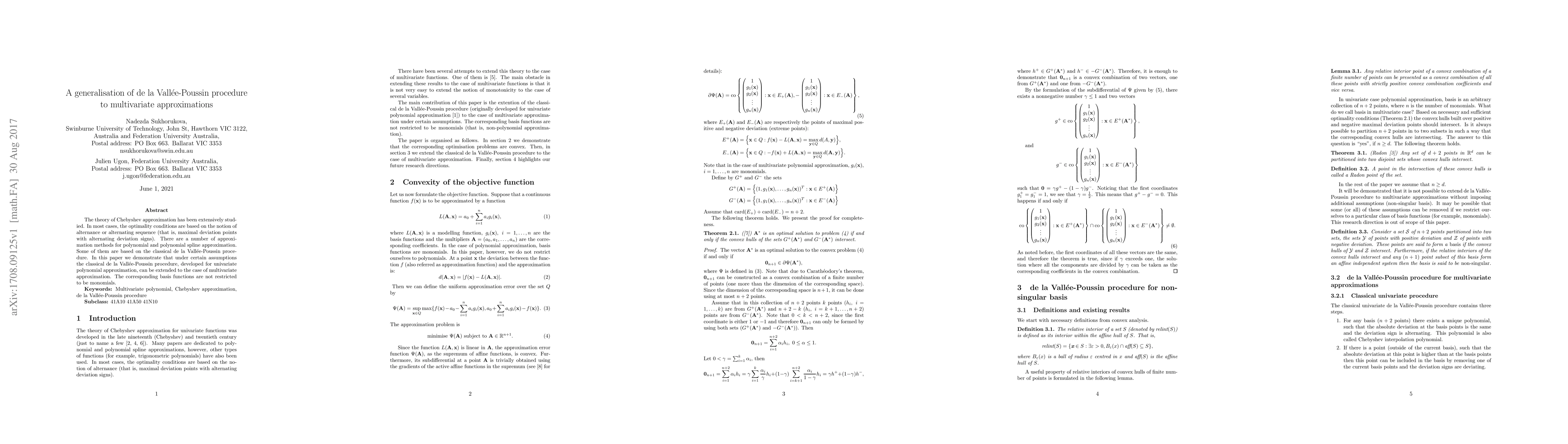 This paper extends the classical de la Vallée-Poussin procedure for univariate polynomial approximation to multivariate settings, allowing for basis functions beyond monomials under specific conditions. The study focuses on the optimality conditions for multivariate polynomial and spline approximations based on alternating sequences.