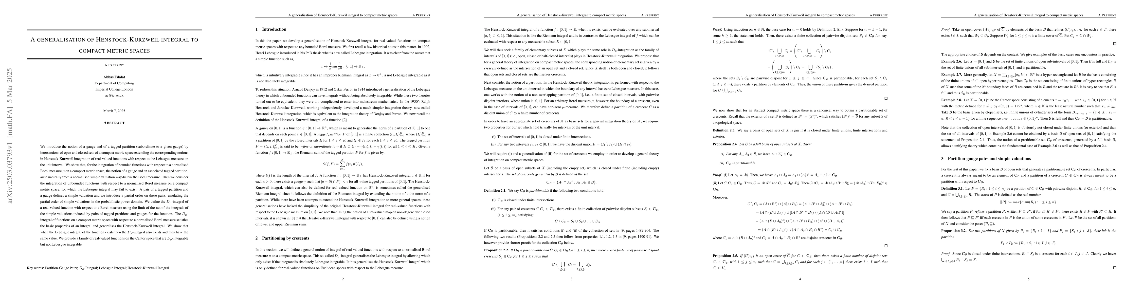 The introduction of the D_μ-integral based on simple valuations and a partial order, extending Henstock-Kurzweil integration to compact metric spaces with respect to normalized Borel measures.