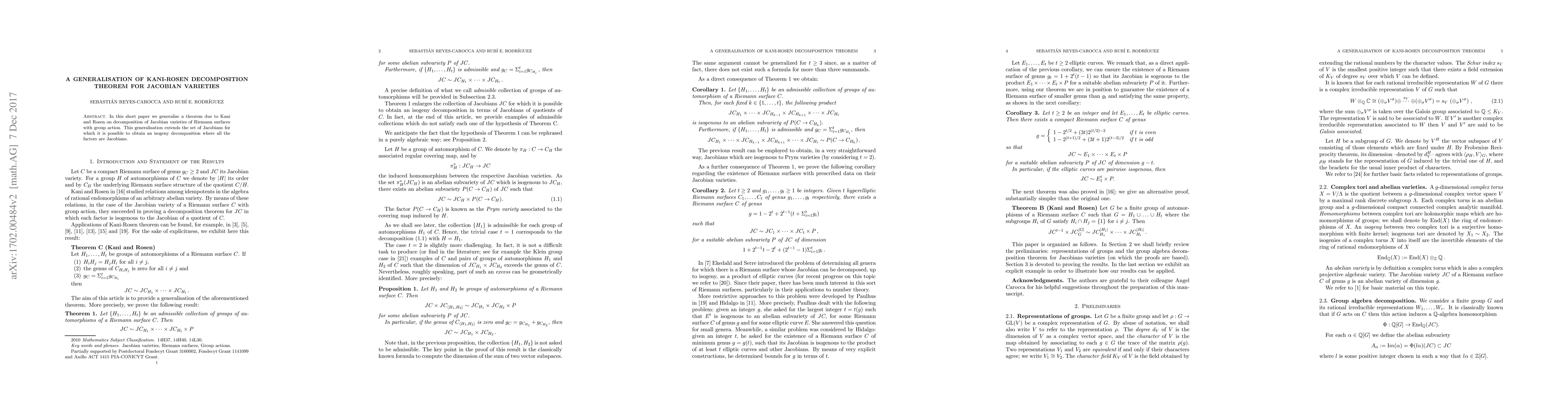 In this short paper we generalise a theorem due to Kani and Rosen on decomposition of Jacobian varieties of Riemann surfaces with group action. This generalisation extends the set of Jacobians for which it is possible to obtain an isogeny decomposition where all the factors are Jacobians.