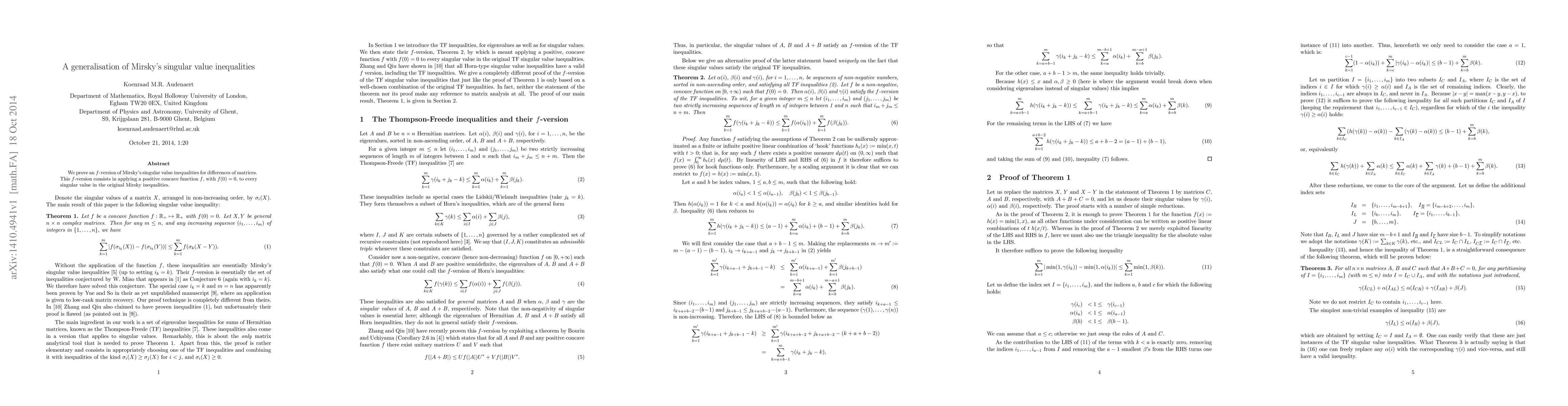 Summary: This paper generalizes Mirsky's singular value inequalities by introducing an f-version that applies a positive concave function f (with f(0)=0) to the singular values, thereby extending the original inequalities to matrix differences.