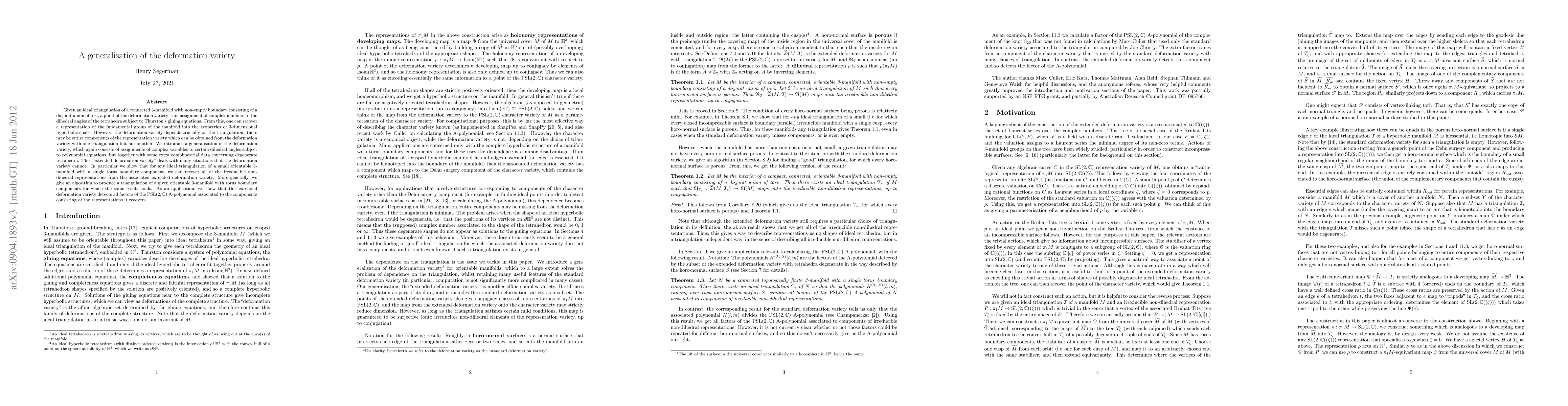 Given an ideal triangulation of a connected 3-manifold with non-empty boundary consisting of a disjoint union of tori, a point of the deformation variety is an assignment of complex numbers to the dihedral angles of the tetrahedra subject to Thurston's gluing equations. From this, one can recover a representation of the fundamental group of the manifold into the isometries of 3-dimensional hyperbolic space. However, the deformation variety depends crucially on the triangulation: there may be entire components of the representation variety which can be obtained from the deformation variety with one triangulation but not another. We introduce a generalisation of the deformation variety, which again consists of assignments of complex variables to certain dihedral angles subject to polynomial equations, but together with some extra combinatorial data concerning degenerate tetrahedra. This "extended deformation variety" deals with many situations that the deformation variety cannot. In particular we show that for any ideal triangulation of a small orientable 3-manifold with a single torus boundary component, we can recover all of the irreducible non-dihedral representations from the associated extended deformation variety. More generally, we give an algorithm to produce a triangulation of a given orientable 3-manifold with torus boundary components for which the same result holds. As an application, we show that this extended deformation variety detects all factors of the PSL(2,C) A-polynomial associated to the components consisting of the representations it recovers.