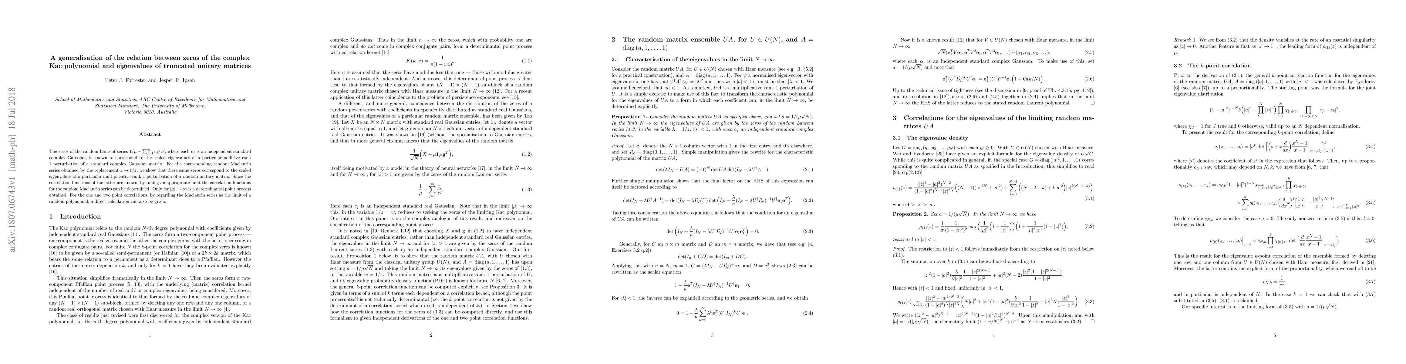 This paper generalizes the relationship between zeros of a complex Kac polynomial and eigenvalues of truncated unitary matrices, showing that zeros correspond to scaled eigenvalues of a multiplicative rank 1 perturbation of a unitary matrix. It determines the correlation functions by taking an appropriate limit, obtaining a determinantal point process for large $|\mu|$.