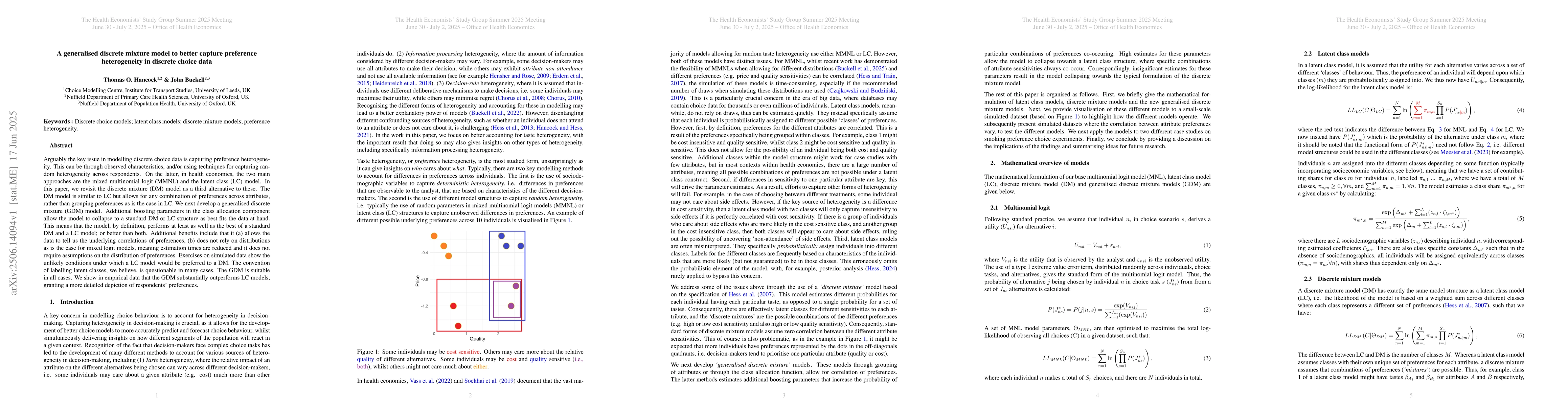Arguably the key issue in modelling discrete choice data is capturing preference heterogeneity. This can be through observed characteristics, and/or using techniques for capturing random heterogeneity across respondents. On the latter, in health economics, the two main approaches are the mixed multinomial logit (MMNL) and the latent class (LC) model. In this paper, we revisit the discrete mixture (DM) model as a third alternative to these. The DM model is similar to LC but allows for any combination of preferences across attributes, rather than grouping preferences as is the case in LC. We next develop a generalised discrete mixture (GDM) model. Additional boosting parameters in the class allocation component allow the model to collapse to a standard DM or LC structure as best fits the data at hand. This means that the model, by definition, performs at least as well as the best of a standard DM and a LC model; or better than both. Additional benefits include that it (a) allows the data to tell us the underlying correlations of preferences, (b) does not rely on distributions as is the case for mixed logit models, meaning estimation times are reduced and it does not require assumptions on the distribution of preferences. Exercises on simulated data show the unlikely conditions under which a LC model would be preferred to a DM. The convention of labelling latent classes, we believe, is questionable in many cases. The GDM is suitable in all cases. We show in empirical data that the GDM substantially outperforms LC models, granting a more detailed depiction of respondents' preferences.