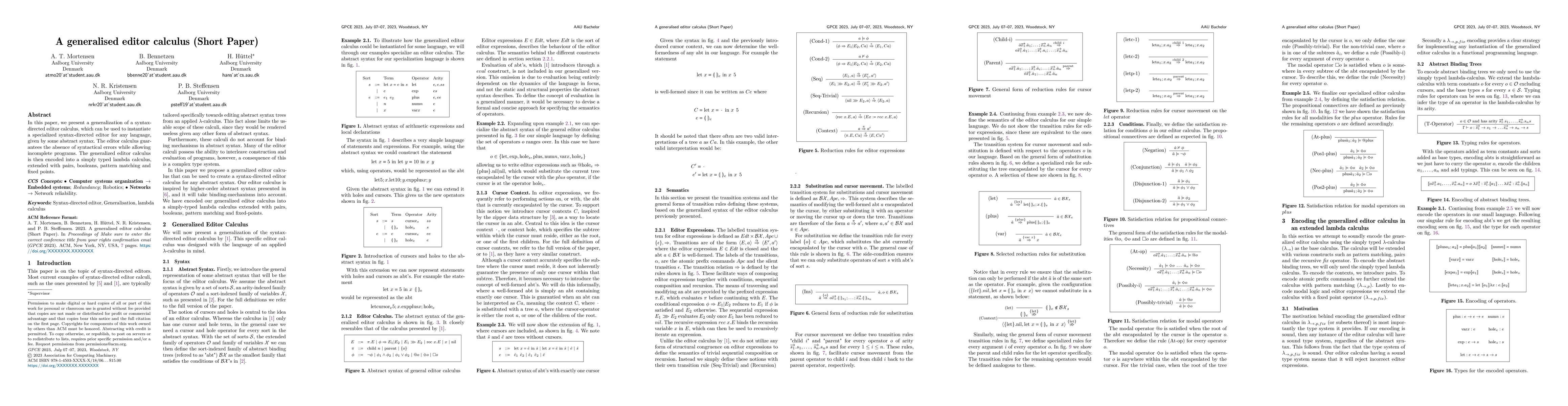 The paper presents a generalization of a syntax-directed editor calculus, instantiated for any language given an abstract syntax, and encodes it into a simply typed lambda calculus with extensions.