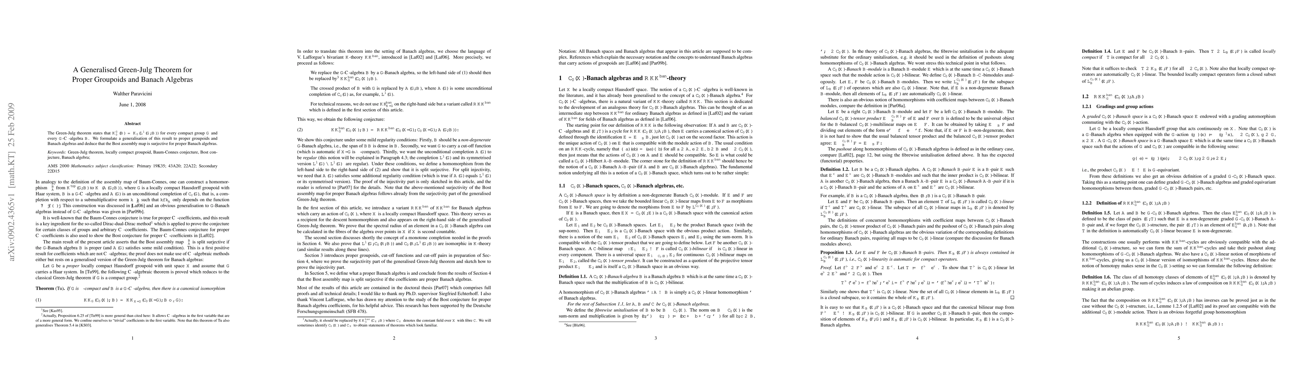 Summary: The paper generalises the Green-Julg theorem to proper groupoids and Banach algebras, proving the surjectivity of the Bost assembly map and demonstrating that the spectral radius in a C_0(X)-Banach algebra can be derived from the spectral radius in its fibres.