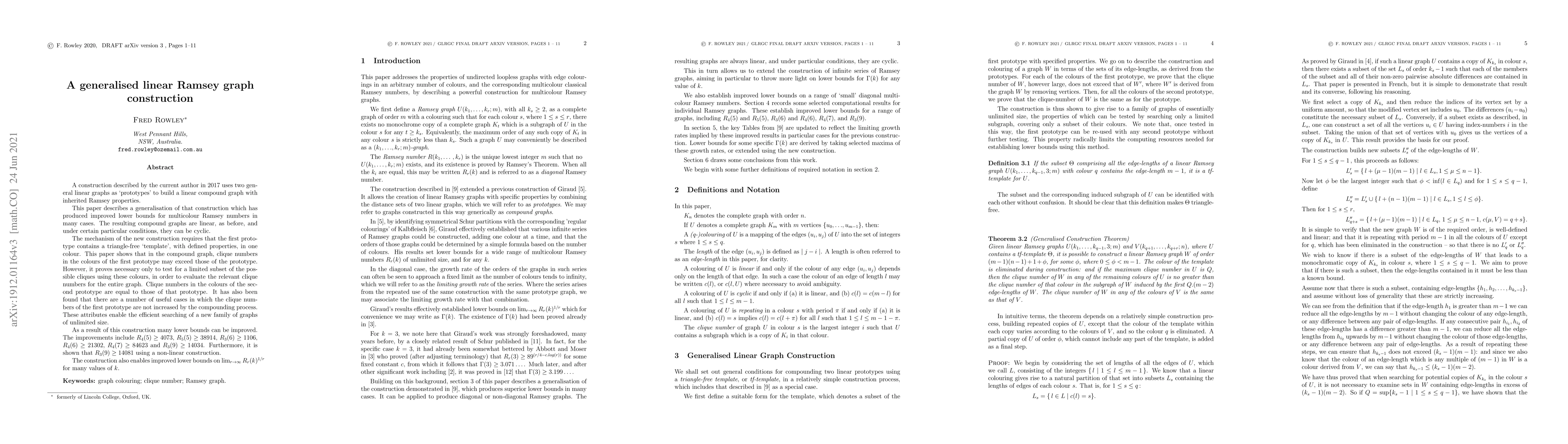 A construction described by the current author in 2017 uses two linear `prototype' graphs to build a compound graph with Ramsey properties inherited from the prototypes. This paper describes a generalisation of that construction which has produced improved lower bounds in many cases for multicolour Ramsey numbers. The resulting graphs are linear, as before, and under certain specific conditions set out here, they can be cyclic. The mechanism of the new construction requires that the first prototype contains a triangle-free `template' in one colour, with defined properties. This paper shows that in the compound graph, clique numbers in the colours of the first prototype may exceed those of the prototype. However, it proves necessary only to test for a limited subset of the possible cliques using these colours, in order to evaluate the relevant clique numbers for the entire graph. Clique numbers in the colours of the second prototype are equal to those of that prototype. These attributes enable the efficient searching of a new family of graphs based on the `template' approach. It has also been found that there are a number of useful cases in which the clique numbers of the first prototype are not increased by the compounding process. As a result of this construction many lower bounds can be improved. The improvements include $R_4(5) \ge 4073$, $R_5(5) \ge 38914$, $R_3(6) \ge 1106$, $R_4(6) \ge 21302$, $R_4(7) \ge 84623$ and $R_3(9) \ge 14034$. It is also shown that $R_3(9) \ge 14081$ using a non-linear construction.