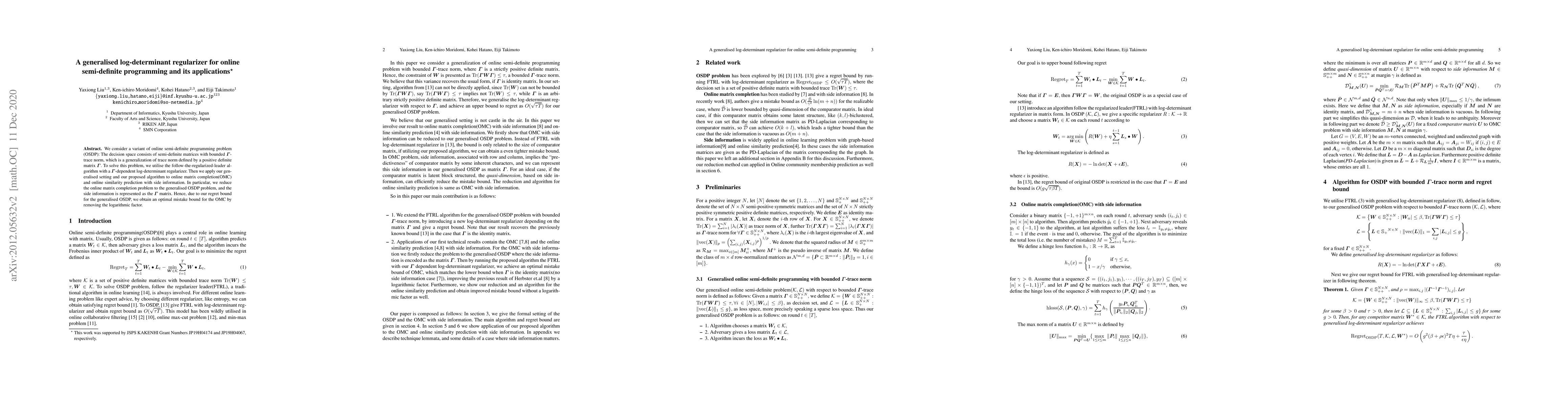 This paper proposes a generalised log-determinant regularizer for solving online semi-definite programming problems with bounded $\Gamma$-trace norm. The method is applied to online matrix completion and online similarity prediction, achieving an optimal mistake bound for matrix completion by leveraging the regret bound of the generalised OSDP.