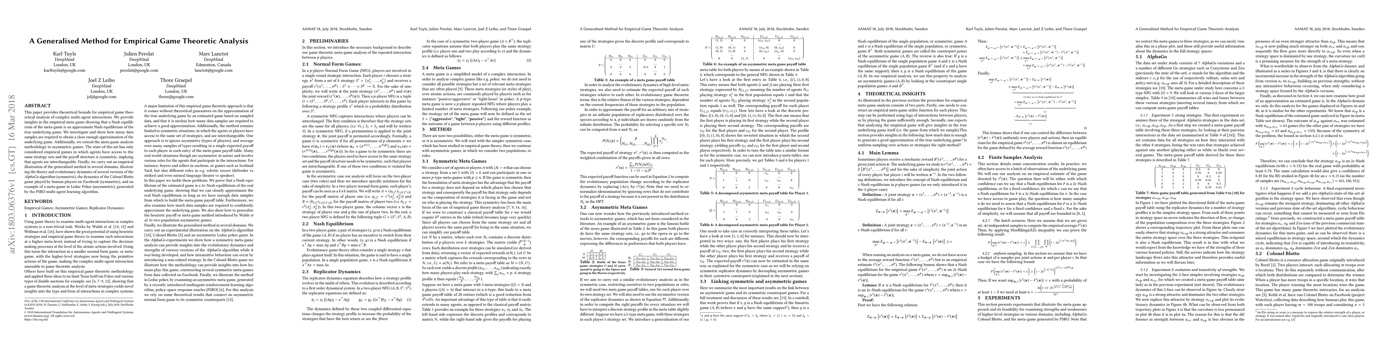 This paper provides theoretical bounds for empirical game theoretical analysis of complex multi-agent interactions. We provide insights in the empirical meta game showing that a Nash equilibrium of the meta-game is an approximate Nash equilibrium of the true underlying game. We investigate and show how many data samples are required to obtain a close enough approximation of the underlying game. Additionally, we extend the meta-game analysis methodology to asymmetric games. The state-of-the-art has only considered empirical games in which agents have access to the same strategy sets and the payoff structure is symmetric, implying that agents are interchangeable. Finally, we carry out an empirical illustration of the generalised method in several domains, illustrating the theory and evolutionary dynamics of several versions of the AlphaGo algorithm (symmetric), the dynamics of the Colonel Blotto game played by human players on Facebook (symmetric), and an example of a meta-game in Leduc Poker (asymmetric), generated by the PSRO multi-agent learning algorithm.