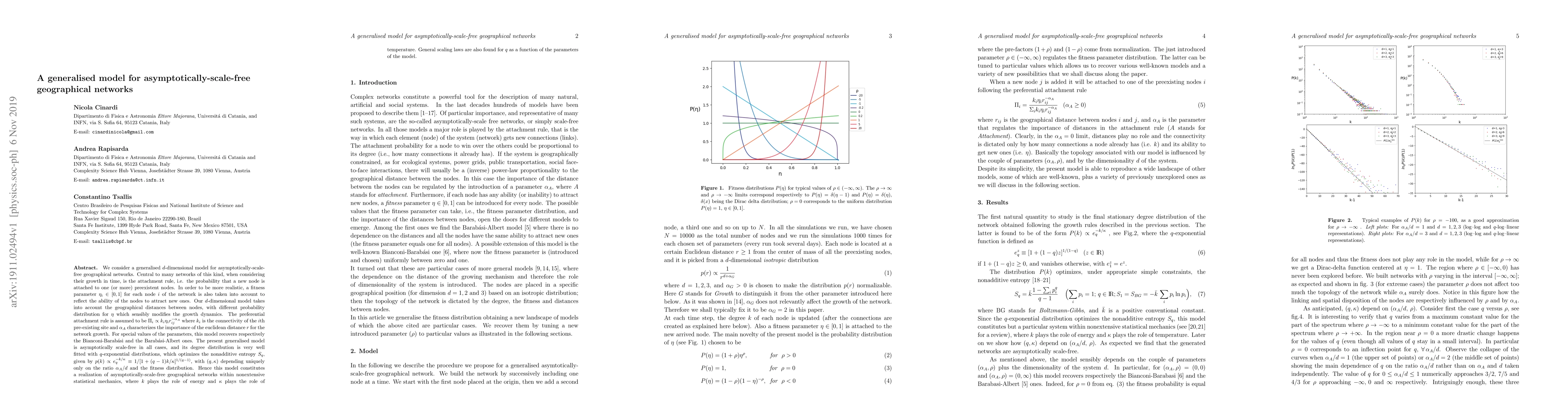We consider a generalised d-dimensional model for asymptotically-scale-free geographical networks. Central to many networks of this kind, when considering their growth in time, is the attachment rule, i.e. the probability that a new node is attached to one (or more) preexistent nodes. In order to be more realistic, a fitness parameter $\eta_i \in [0,1]$ for each node $i$ of the network is also taken into account to reflect the ability of the nodes to attract new ones. Our d-dimensional model takes into account the geographical distances between nodes, with different probability distribution for $\eta$ which sensibly modifies the growth dynamics. The preferential attachment rule is assumed to be $\Pi_i\propto k_i \eta_i r_{ij}^{-\alpha_A} $ where $k_i$ is the connectivity of the $i$th pre-existing site and $\alpha_A$ characterizes the importance of the euclidean distance r for the network growth. For special values of the parameters, this model recovers respectively the Bianconi-Barab\'{a}si and the Barab\'{a}si-Albert ones. The present generalised model is asymptotically scale-free in all cases, and its degree distribution is very well fitted with q-exponential distributions, which optimise the nonadditive entropy $S_q$, given by $p(k) \propto e_q^{-k/\kappa} \equiv 1/[1+(q-1)k/\kappa]^{1/(q-1)}$, with $(q,\kappa)$ depending uniquely only on the ratio $\alpha_A/d$ and the fitness distribution. Hence this model constitutes a realization of asymptotically-scale-free geographical networks within nonextensive statistical mechanics, where $k$ plays the role of energy and $\kappa$ plays the role of temperature. General scaling laws are also found for q as a function of the parameters of the model.