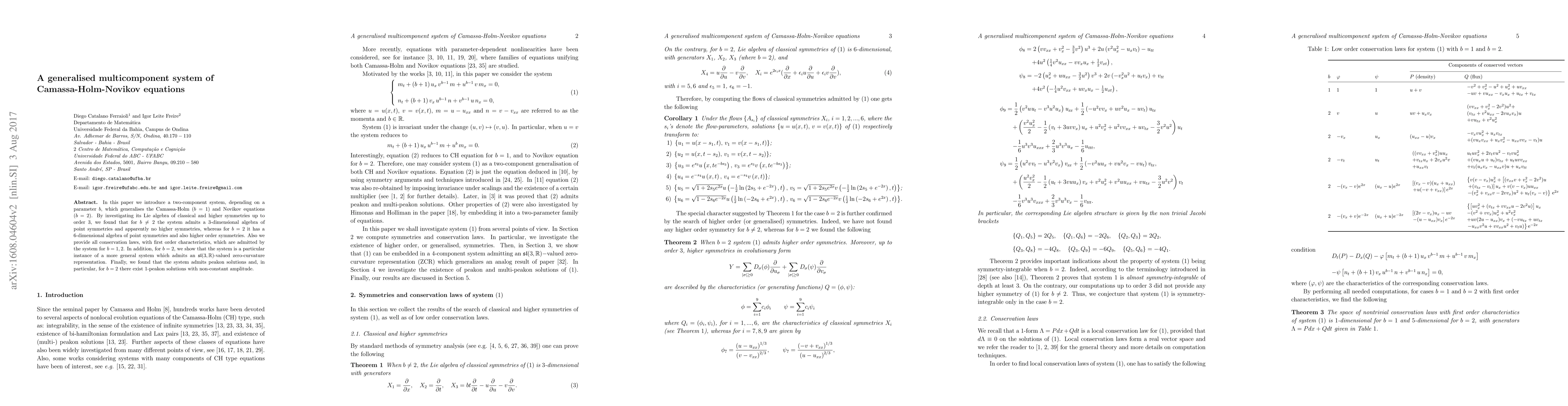 In this paper we introduce a two-component system, depending on a parameter $b$, which generalises the Camassa-Holm ($b=1$) and Novikov equations ($b=2$). By investigating its Lie algebra of classical and higher symmetries up to order $3$, we found that for $b\neq 2$ the system admits a $3$-dimensional algebra of point symmetries and apparently no higher symmetries, whereas for $b=2$ it has a $6$-dimensional algebra of point symmetries and also higher order symmetries. Also we provide all conservation laws, with first order characteristics, which are admitted by the system for $b=1,2$. In addition, for $b=2$, we show that the system is a particular instance of a more general system which admits an $\mathfrak{sl}(3,\mathbb{R})$-valued zero-curvature representation. Finally, we found that the system admits peakon solutions and, in particular, for $b=2$ there exist 1-peakon solutions with non-constant amplitude.