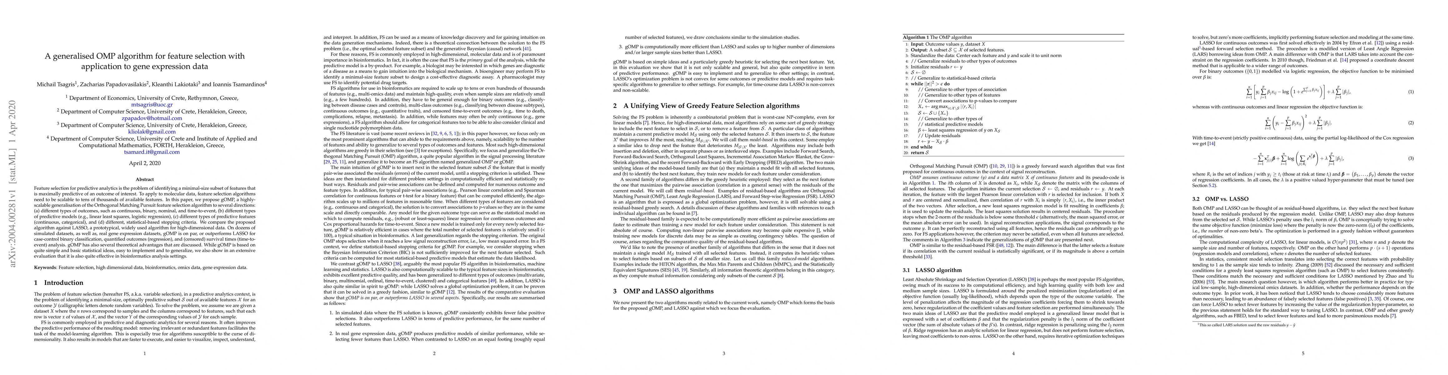 Feature selection for predictive analytics is the problem of identifying a minimal-size subset of features that is maximally predictive of an outcome of interest. To apply to molecular data, feature selection algorithms need to be scalable to tens of thousands of available features. In this paper, we propose gOMP, a highly-scalable generalisation of the Orthogonal Matching Pursuit feature selection algorithm to several directions: (a) different types of outcomes, such as continuous, binary, nominal, and time-to-event, (b) different types of predictive models (e.g., linear least squares, logistic regression), (c) different types of predictive features (continuous, categorical), and (d) different, statistical-based stopping criteria. We compare the proposed algorithm against LASSO, a prototypical, widely used algorithm for high-dimensional data. On dozens of simulated datasets, as well as, real gene expression datasets, gOMP is on par, or outperforms LASSO for case-control binary classification, quantified outcomes (regression), and (censored) survival times (time-to-event) analysis. gOMP has also several theoretical advantages that are discussed. While gOMP is based on quite simple and basic statistical ideas, easy to implement and to generalize, we also show in an extensive evaluation that it is also quite effective in bioinformatics analysis settings.