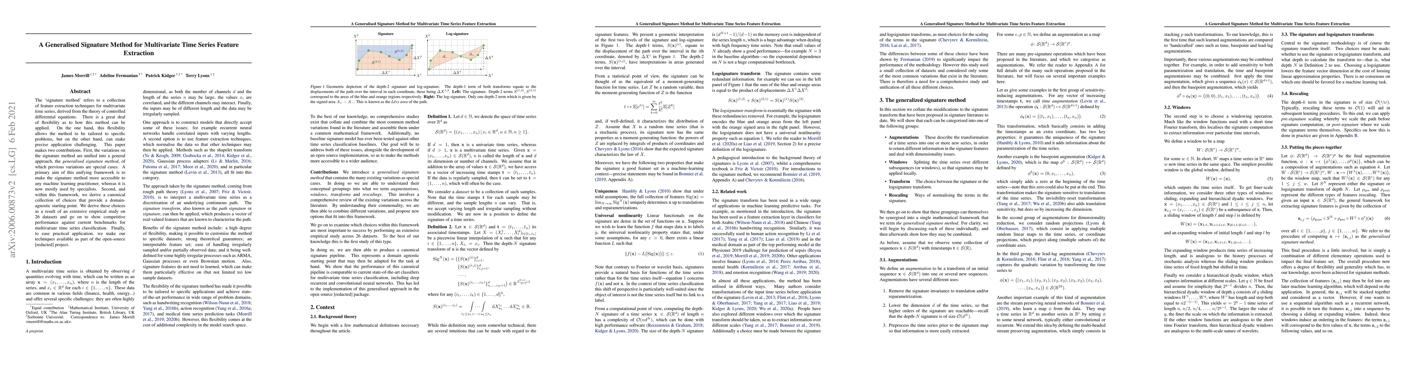 The 'signature method' refers to a collection of feature extraction techniques for multivariate time series, derived from the theory of controlled differential equations. There is a great deal of flexibility as to how this method can be applied. On the one hand, this flexibility allows the method to be tailored to specific problems, but on the other hand, can make precise application challenging. This paper makes two contributions. First, the variations on the signature method are unified into a general approach, the \emph{generalised signature method}, of which previous variations are special cases. A primary aim of this unifying framework is to make the signature method more accessible to any machine learning practitioner, whereas it is now mostly used by specialists. Second, and within this framework, we derive a canonical collection of choices that provide a domain-agnostic starting point. We derive these choices as a result of an extensive empirical study on 26 datasets and go on to show competitive performance against current benchmarks for multivariate time series classification. Finally, to ease practical application, we make our techniques available as part of the open-source [redacted] project.