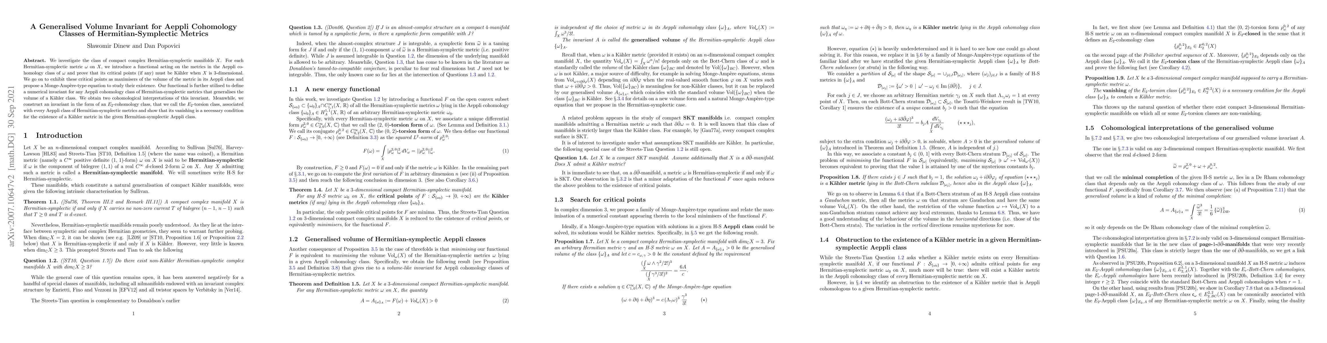This paper introduces a generalised volume invariant for Aeppli cohomology classes of Hermitian-symplectic metrics on compact complex manifolds, proving that critical points of this functional are Kähler when the dimension is three. It also constructs an $E_2$-cohomology class, termed the $E_2$-torsion class, which vanishes if a Kähler metric exists within the given Aeppli class.