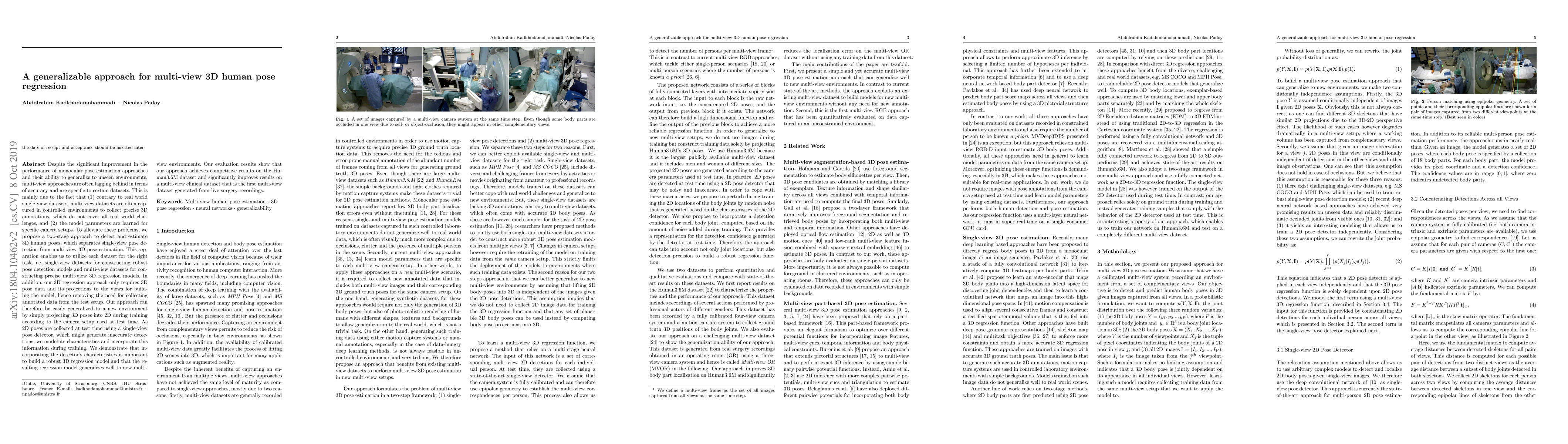 Despite the significant improvement in the performance of monocular pose estimation approaches and their ability to generalize to unseen environments, multi-view (MV) approaches are often lagging behind in terms of accuracy and are specific to certain datasets. This is mainly due to the fact that (1) contrary to real world single-view (SV) datasets, MV datasets are often captured in controlled environments to collect precise 3D annotations, which do not cover all real world challenges, and (2) the model parameters are learned for specific camera setups. To alleviate these problems, we propose a two-stage approach to detect and estimate 3D human poses, which separates SV pose detection from MV 3D pose estimation. This separation enables us to utilize each dataset for the right task, i.e. SV datasets for constructing robust pose detection models and MV datasets for constructing precise MV 3D regression models. In addition, our 3D regression approach only requires 3D pose data and its projections to the views for building the model, hence removing the need for collecting annotated data from the test setup. Our approach can therefore be easily generalized to a new environment by simply projecting 3D poses into 2D during training according to the camera setup used at test time. As 2D poses are collected at test time using a SV pose detector, which might generate inaccurate detections, we model its characteristics and incorporate this information during training. We demonstrate that incorporating the detector's characteristics is important to build a robust 3D regression model and that the resulting regression model generalizes well to new MV environments. Our evaluation results show that our approach achieves competitive results on the Human3.6M dataset and significantly improves results on a MV clinical dataset that is the first MV dataset generated from live surgery recordings.