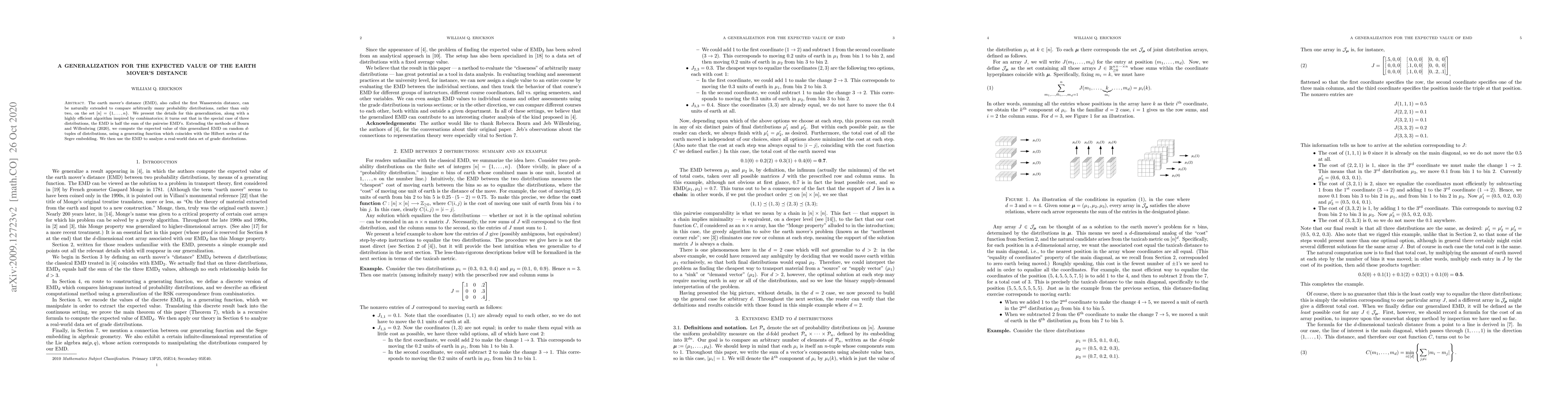 The earth mover's distance (EMD), also called the first Wasserstein distance, can be naturally extended to compare arbitrarily many probability distributions, rather than only two, on the set $[n]=\{1,\dots,n\}$. We present the details for this generalization, along with a highly efficient algorithm inspired by combinatorics; it turns out that in the special case of three distributions, the EMD is half the sum of the pairwise EMD's. Extending the methods of Bourn and Willenbring (arXiv:1903.03673), we compute the expected value of this generalized EMD on random $d$-tuples of distributions, using a generating function which coincides with the Hilbert series of the Segre embedding. We then use the EMD to analyze a real-world data set of grade distributions.