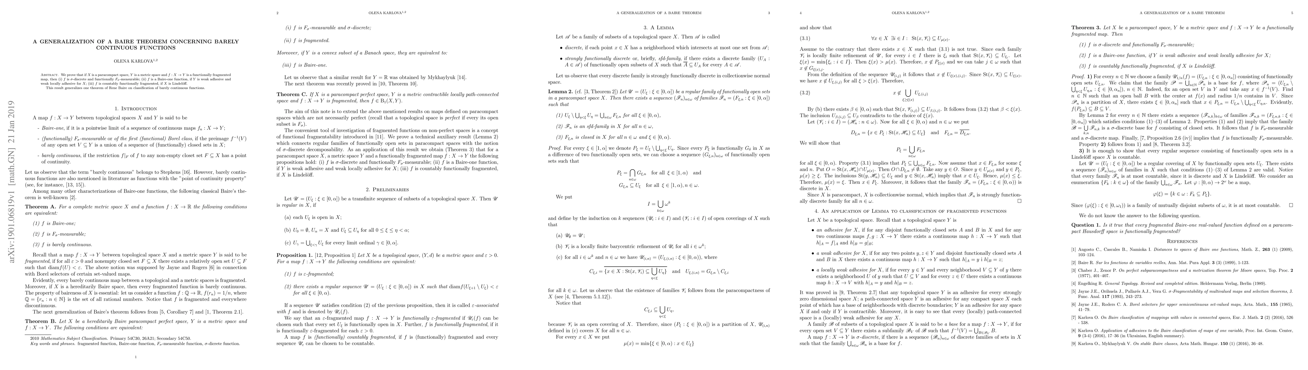 This paper generalizes a Baire theorem by proving that a functionally fragmented map from a paracompact space to a metric space is $\sigma$-discrete, $F_\sigma$-measurable, and a Baire-one function under certain conditions on the metric space. The result extends the classification of barely continuous functions.