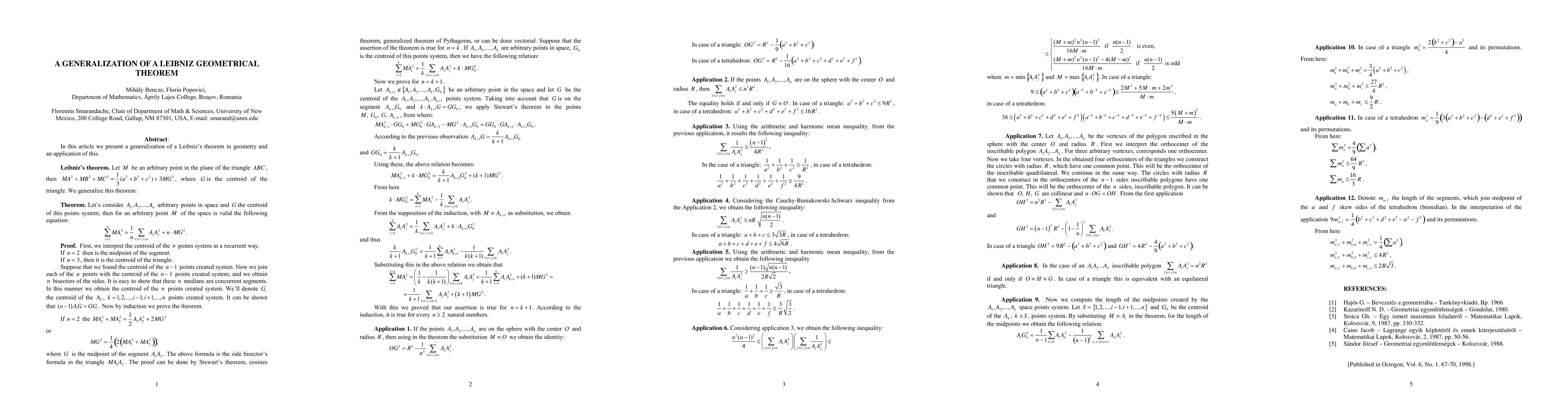In this article we present a generalization of a Leibniz's geometrical theorem and an application of it.