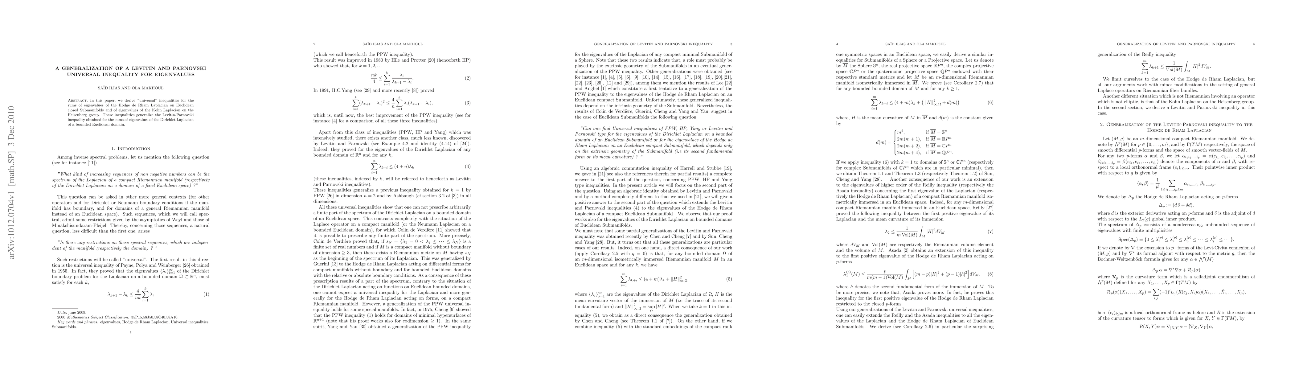 In this paper, we derive "universal" inequalities for the sums of eigenvalues of the Hodge de Rham Laplacian on Euclidean closed Submanifolds and of eigenvalues of the Kohn Laplacian on the Heisenberg group. These inequalities generalize the Levitin-Parnovski inequality obtained for the sums of eigenvalues of the Dirichlet Laplacian of a bounded Euclidean domain. New Reilly and Asada inequalities are also obtained.