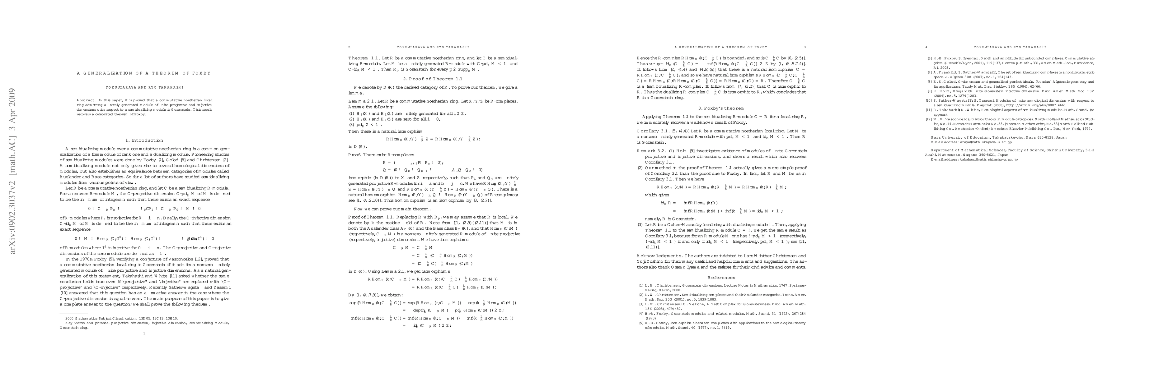 A commutative noetherian local ring is proven to be Gorenstein if it has a finitely generated module with finite projective and injective dimensions over a semidualizing module, recovering Foxby's theorem.