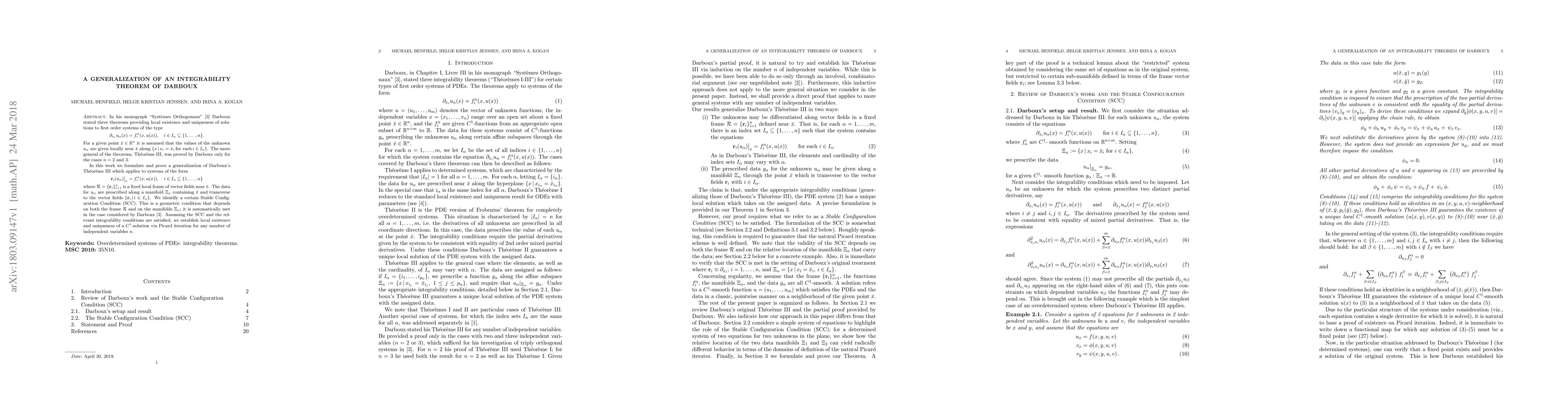 In his monograph "Le\c{c}ons sur les syst\`emes orthogonaux et les coordonn\'ees curvilignes. Principes de g\'eom\'etrie analytique", 1910, Darboux stated three theorems providing local existence and uniqueness of solutions to first order systems of the type \[\partial_{x_i} u_\alpha(x)=f^\alpha_i(x,u(x)),\quad i\in I_\alpha\subseteq\{1,\dots,n\}.\] For a given point $\bar x\in \mathbb{R}^n$ it is assumed that the values of the unknown $u_\alpha$ are given locally near $\bar x$ along $\{x\,|\, x_i=\bar x_i \, \text{for each}\, i\in I_\alpha\}$. The more general of the theorems, Th\'eor\`eme III, was proved by Darboux only for the cases $n=2$ and $3$. In this work we formulate and prove a generalization of Darboux's Th\'eor\`eme III which applies to systems of the form \[{\mathbf r}_i(u_\alpha)\big|_x = f_i^\alpha (x, u(x)), \quad i\in I_\alpha\subseteq\{1,\dots,n\}\] where $\mathcal R=\{{\mathbf r}_i\}_{i=1}^n$ is a fixed local frame of vector fields near $\bar x$. The data for $u_\alpha$ are prescribed along a manifold $\Xi_\alpha$ containing $\bar x$ and transverse to the vector fields $\{{\mathbf r}_i\,|\, i\in I_\alpha\}$. We identify a certain Stable Configuration Condition (SCC). This is a geometric condition that depends on both the frame $\mathcal R$ and on the manifolds $\Xi_\alpha$; it is automatically met in the case considered by Darboux. Assuming the SCC and the relevant integrability conditions are satisfied, we establish local existence and uniqueness of a $C^1$-solution via Picard iteration for any number of independent variables $n$.